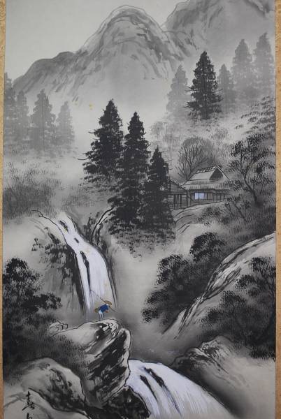 真作/春泉 山水釣人図 /掛軸☆宝船☆K-413 J