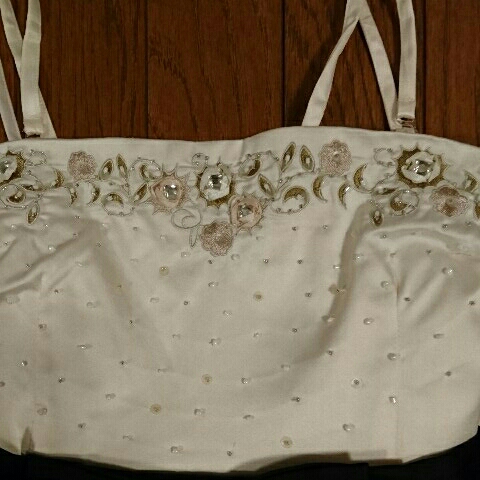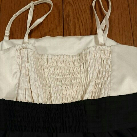 パーティーで二回着用しました。サイドファスナーです。光沢のある生地で華やかな感じです。肩紐調節可能。サイドファスナー内側近くに小さなシミあり。内側なので見えません。チューブトップからスカートまでの着丈約68。