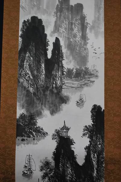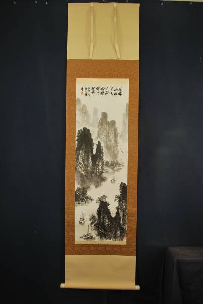 作者不詳/桂林山水画賛//掛軸☆宝船☆K-519 J