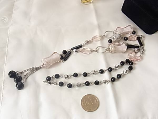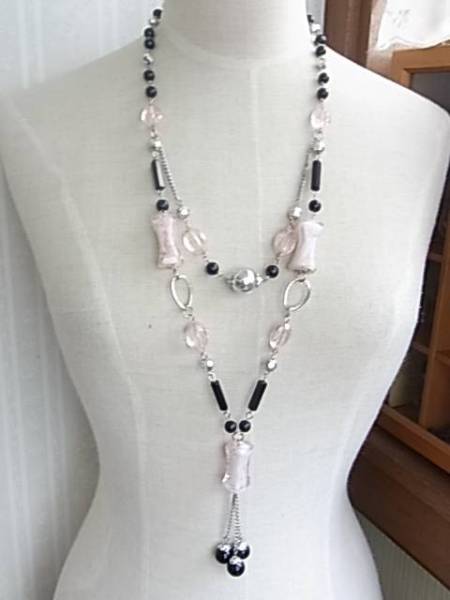 ☆ガラス風ビーズストーン 桜色と黒のコンビが綺麗 Y字デザインのロング2連ネックレス++