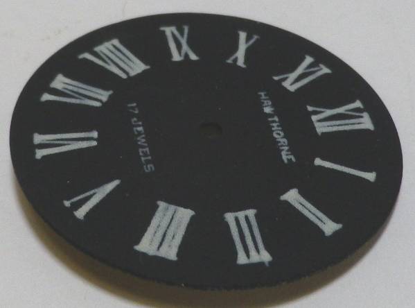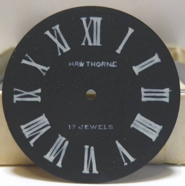SWISSの時計メーカー『HAWTHORNE』の文字盤です。人気の黒文字盤です。円形文字盤です。未使用のデッドストックです(若干微細な擦れあり)。文字盤の取り付け足は2本です。ムーブメントに取り付け可能です。時計パーツやディスプレイとしても良いと思います。一味違う物をお求めの方にお勧め!