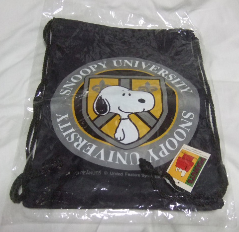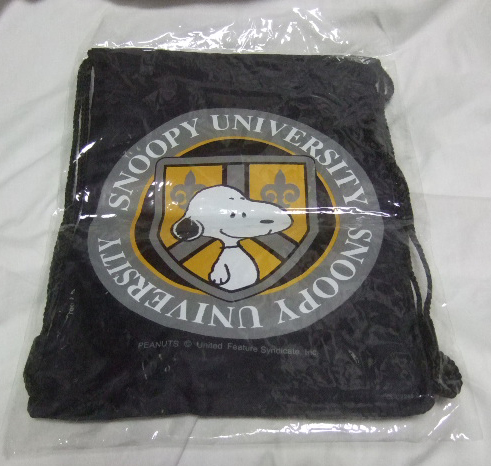 スヌーピーの巾着袋(黒,横:27cm x 縦:36cm)。