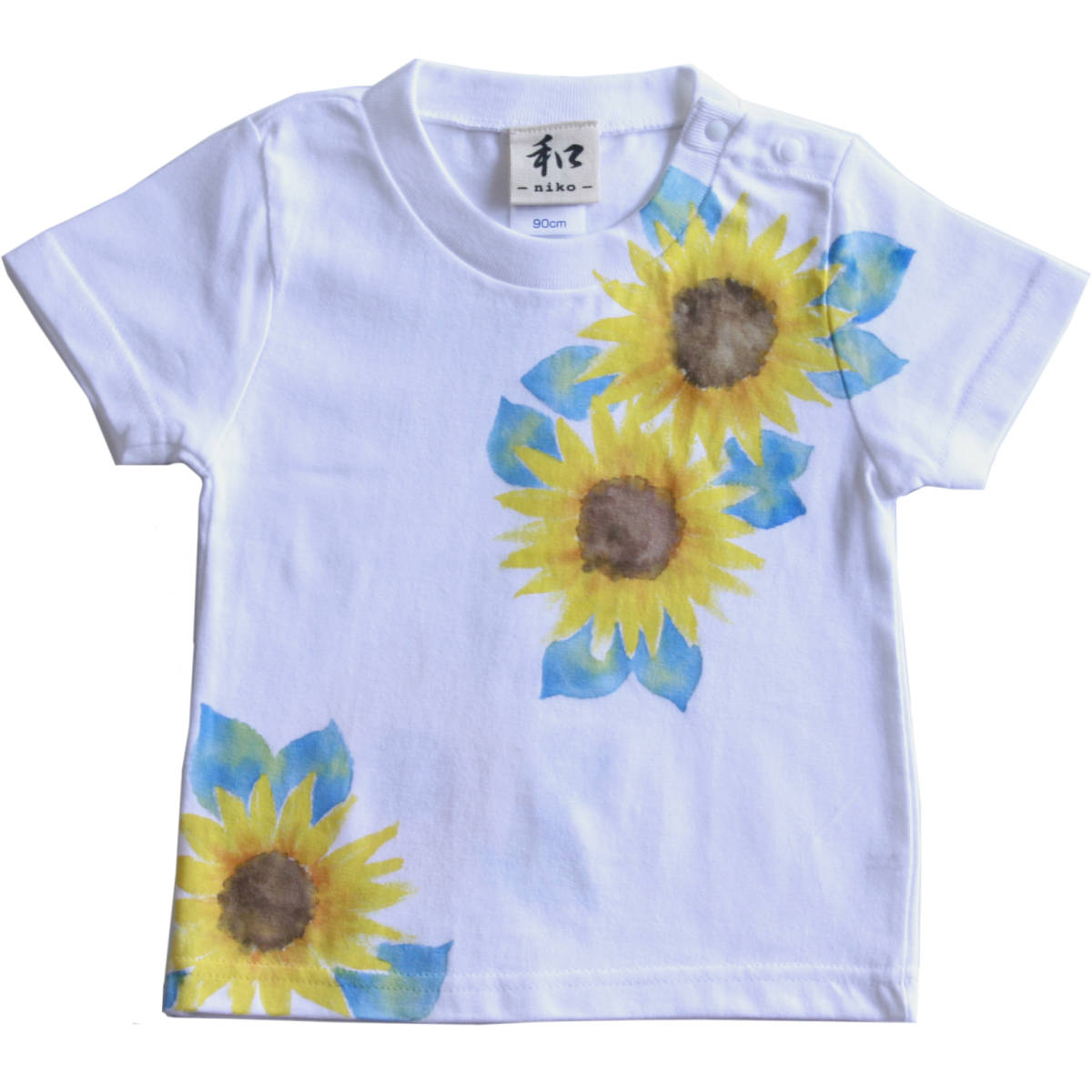 ハンドメイド 手描きTシャツ キッズTシャツ ひまわり柄Tシャツ 手描きで描いた、ひまわりの花柄Tシャツ | |||
