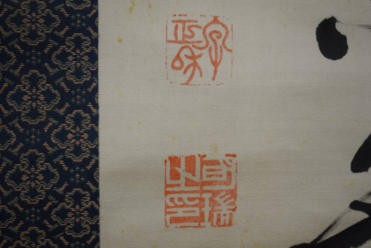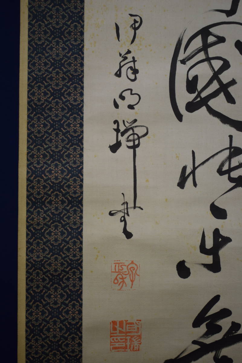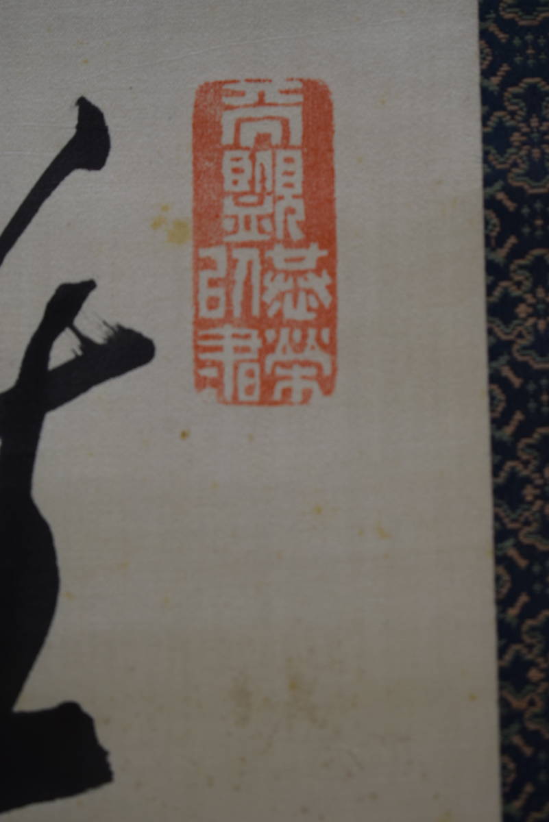 | 【真作】/伊藤明瑞/宮本正雄門/明治の神童書家/二行書/絖本/ ≪参考≫ 伊藤 明瑞(いとう めいずい)(1889年 - 1948年)は日本の書家。本名は宮本 正雄門(みやもと まさおと) 明治22年2月28日、和歌山県和歌山市に生まれる。 明治24年(1891年)、2歳で漢学者南海鐵山に入門し、明治25年(1892年)、3歳で堺県知事に揮毫を披露する。 明治27年(1894年)、5歳で王羲之の書法を体得し、免許皆伝書を授与される。 明治28年(1895年)2月13日、5歳の時、広島大本営において明治天皇の御前で腕前を披露し、「日本明瑞」(明治の明と瑞祥の瑞)の名を与えられ土方久元宮内大臣から印を賜る。 明治36年(1903)伊藤博文の書生となり、これ以後「伊藤明瑞」の号を使う。「伊藤明瑞」を名乗るようになった。 明瑞は、青年期から晩年期まで明石に居住したが、皇族・華族や全国の官公庁・寺院・学校などを回って腕前を披露するなどもした。 明瑞は早くから神童・天才書家と呼ばれ、幼くして古典を暗記するなど博覧強記な人物であったという。 昭和23年(1948年)11月23日、明石の自宅において死去。 ≪作品状態≫ 本紙は絖本肉筆です。 本紙は薄汚れ・全体に多数の糊シミがあります。 表装は概ね良好です。 軸先牙軸 紙箱付 軸丈 縦 194㎝×幅 62㎝ 写真で状態をご判断の上、宜しくお願い致します。 |