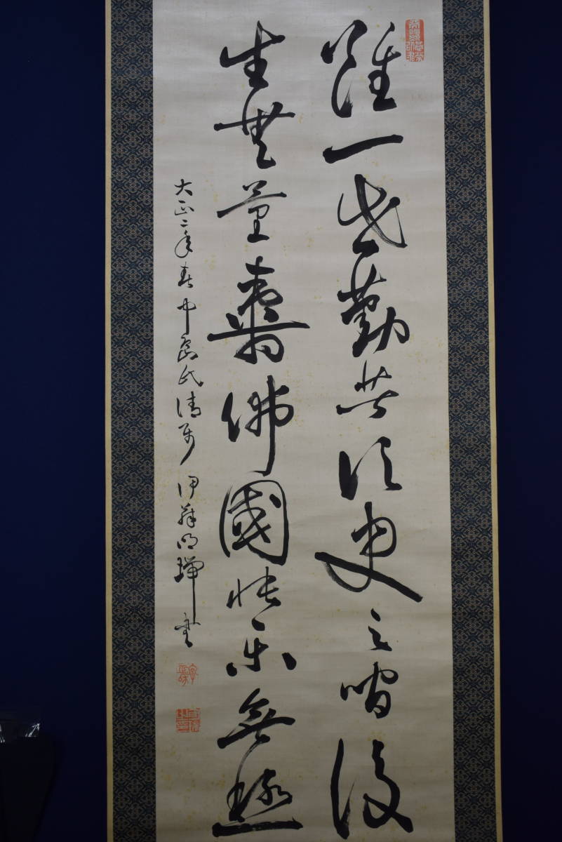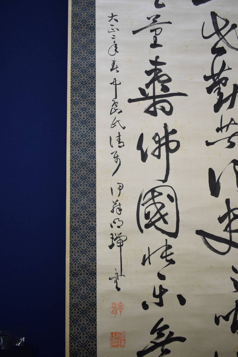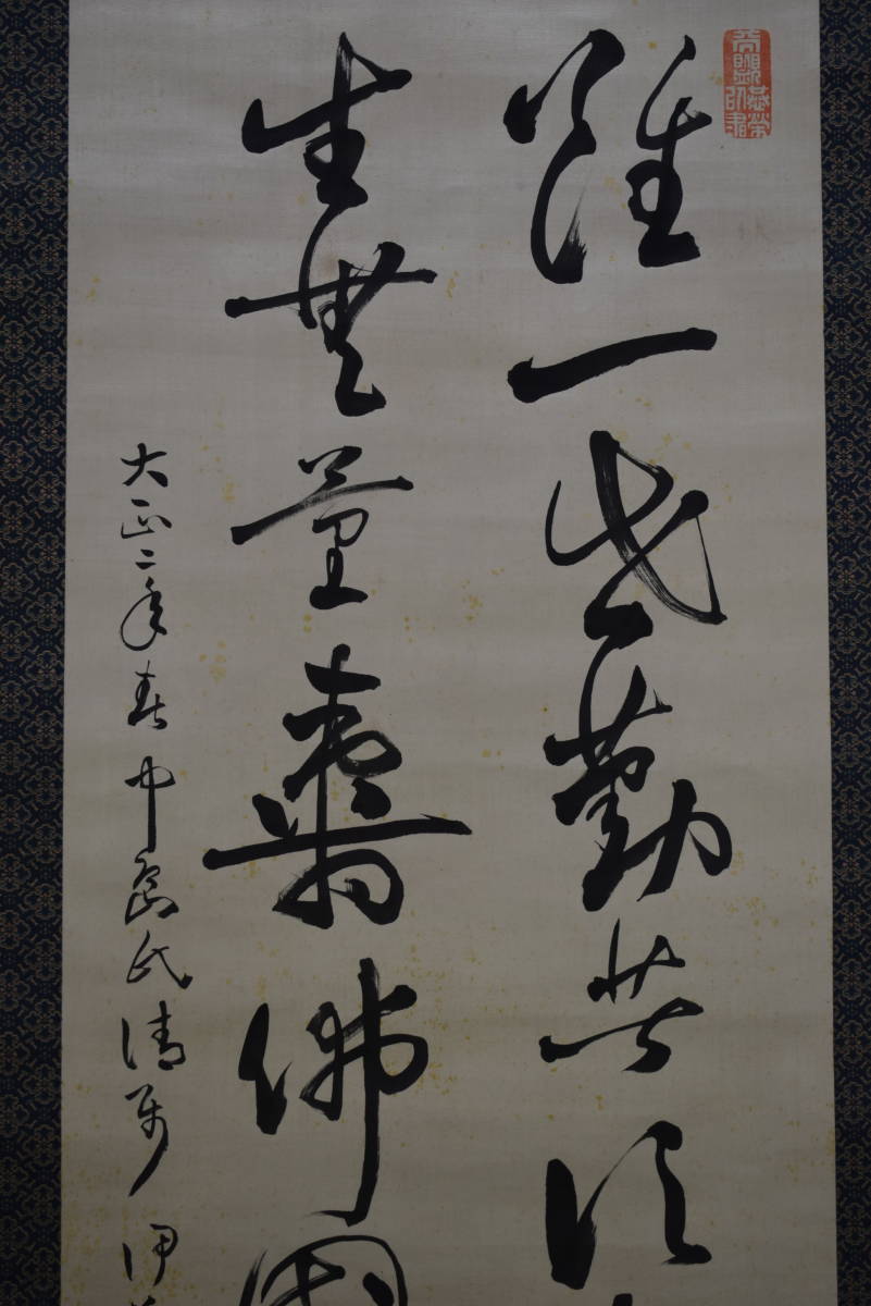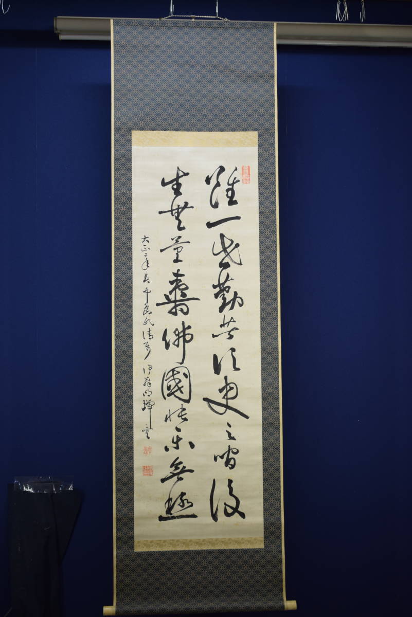 | 【真作】/伊藤明瑞/宮本正雄門/明治の神童書家/二行書/絖本/ ≪参考≫ 伊藤 明瑞(いとう めいずい)(1889年 - 1948年)は日本の書家。本名は宮本 正雄門(みやもと まさおと) 明治22年2月28日、和歌山県和歌山市に生まれる。 明治24年(1891年)、2歳で漢学者南海鐵山に入門し、明治25年(1892年)、3歳で堺県知事に揮毫を披露する。 明治27年(1894年)、5歳で王羲之の書法を体得し、免許皆伝書を授与される。 明治28年(1895年)2月13日、5歳の時、広島大本営において明治天皇の御前で腕前を披露し、「日本明瑞」(明治の明と瑞祥の瑞)の名を与えられ土方久元宮内大臣から印を賜る。 明治36年(1903)伊藤博文の書生となり、これ以後「伊藤明瑞」の号を使う。「伊藤明瑞」を名乗るようになった。 明瑞は、青年期から晩年期まで明石に居住したが、皇族・華族や全国の官公庁・寺院・学校などを回って腕前を披露するなどもした。 明瑞は早くから神童・天才書家と呼ばれ、幼くして古典を暗記するなど博覧強記な人物であったという。 昭和23年(1948年)11月23日、明石の自宅において死去。 ≪作品状態≫ 本紙は絖本肉筆です。 本紙は薄汚れ・全体に多数の糊シミがあります。 表装は概ね良好です。 軸先牙軸 紙箱付 軸丈 縦 194㎝×幅 62㎝ 写真で状態をご判断の上、宜しくお願い致します。 |