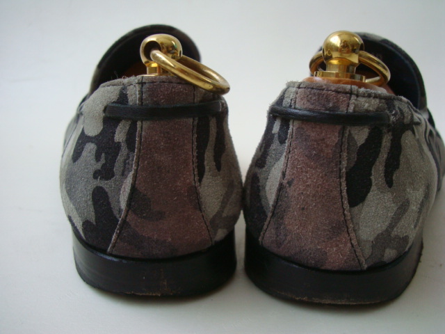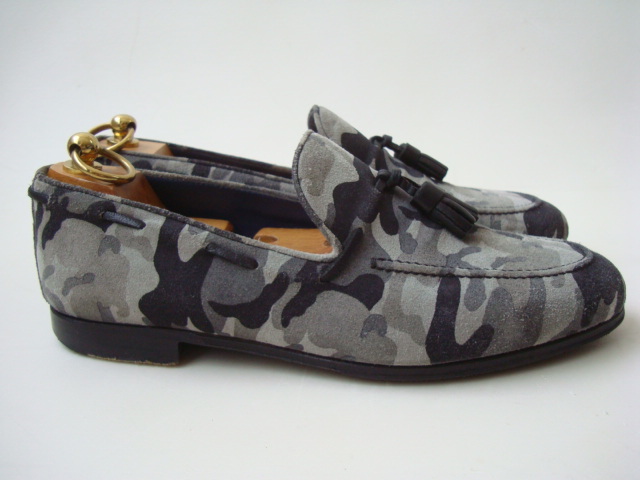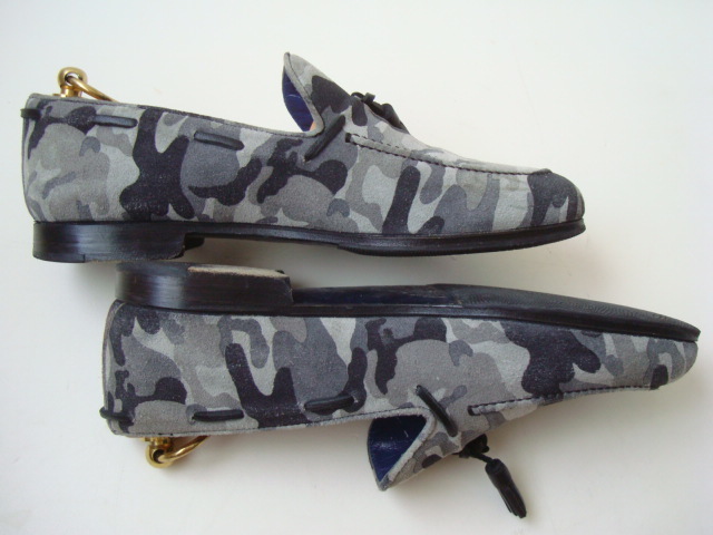 ・風合いの良い上質なレザーを使用し計算された美しいシルエットに迷彩柄と甲のリボン使いが雰囲気抜群でとてもお洒落なスリッポンになります。