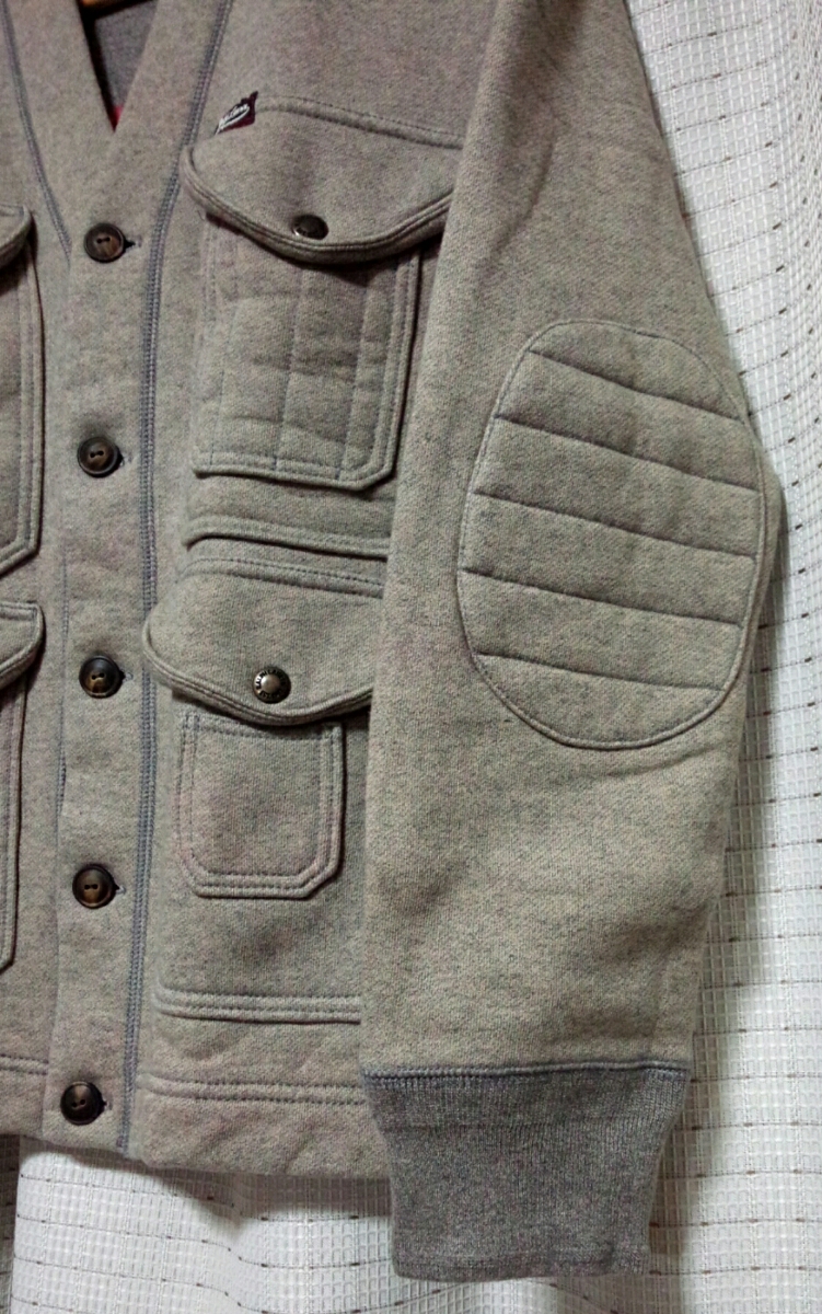 裏地のネイティヴ柄は特に秀逸ですね。肉厚のスウェット地。脇の継ぎと二段仕様の袖リブ。エルボーパッチ。ウッドボタンも凝っています。