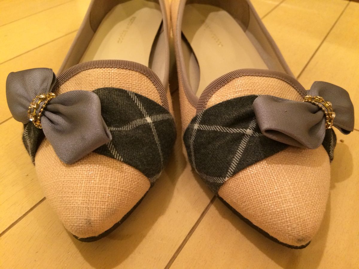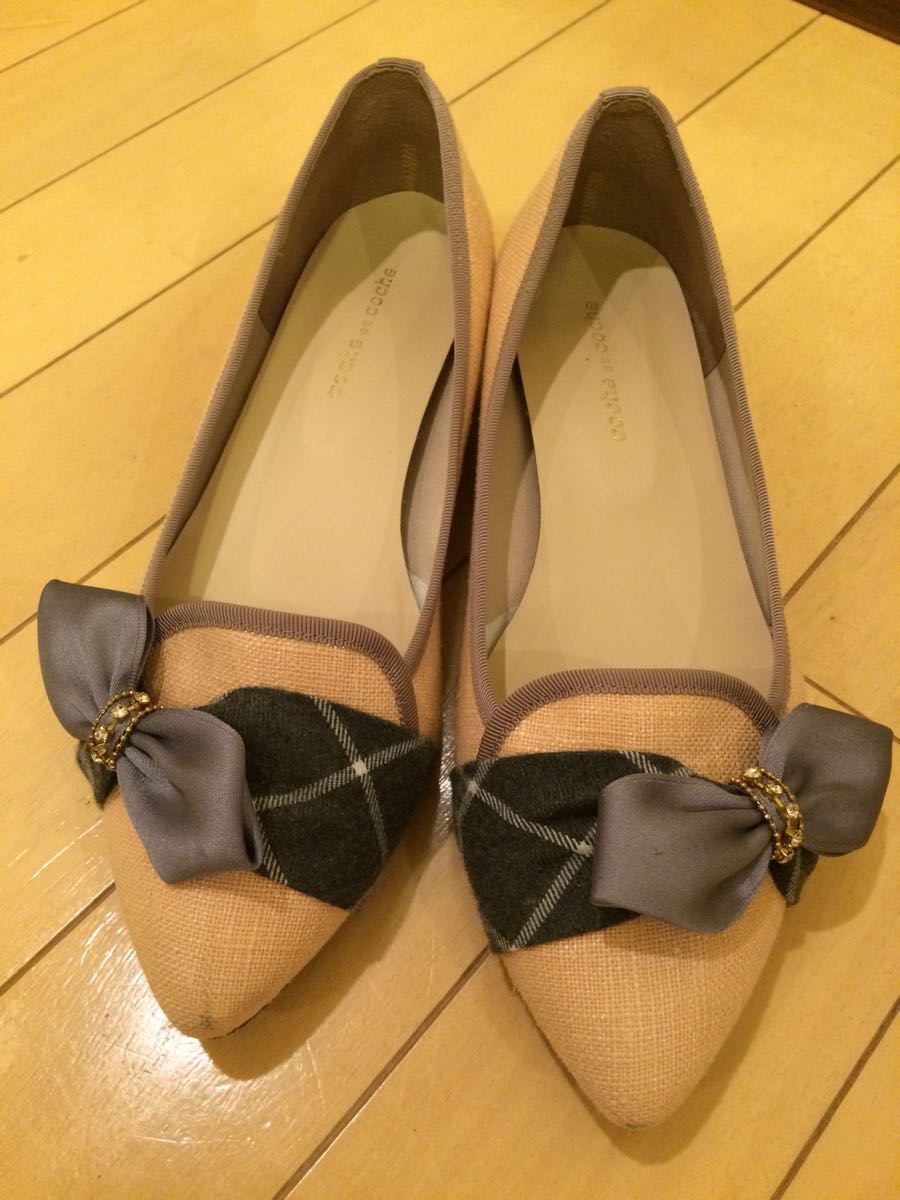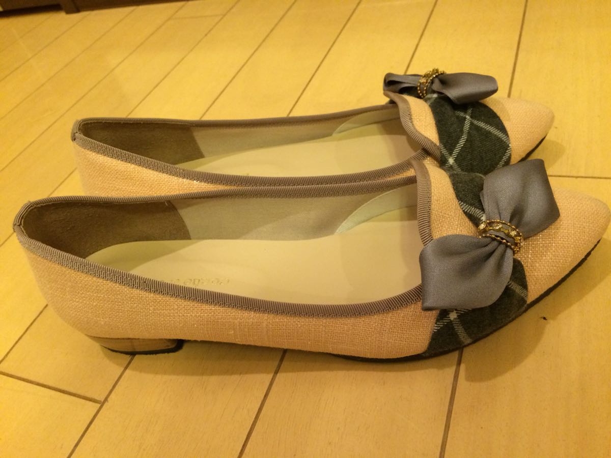 ◆ピンクベージュ×グレーリボン 布製パンプス 24cm◆