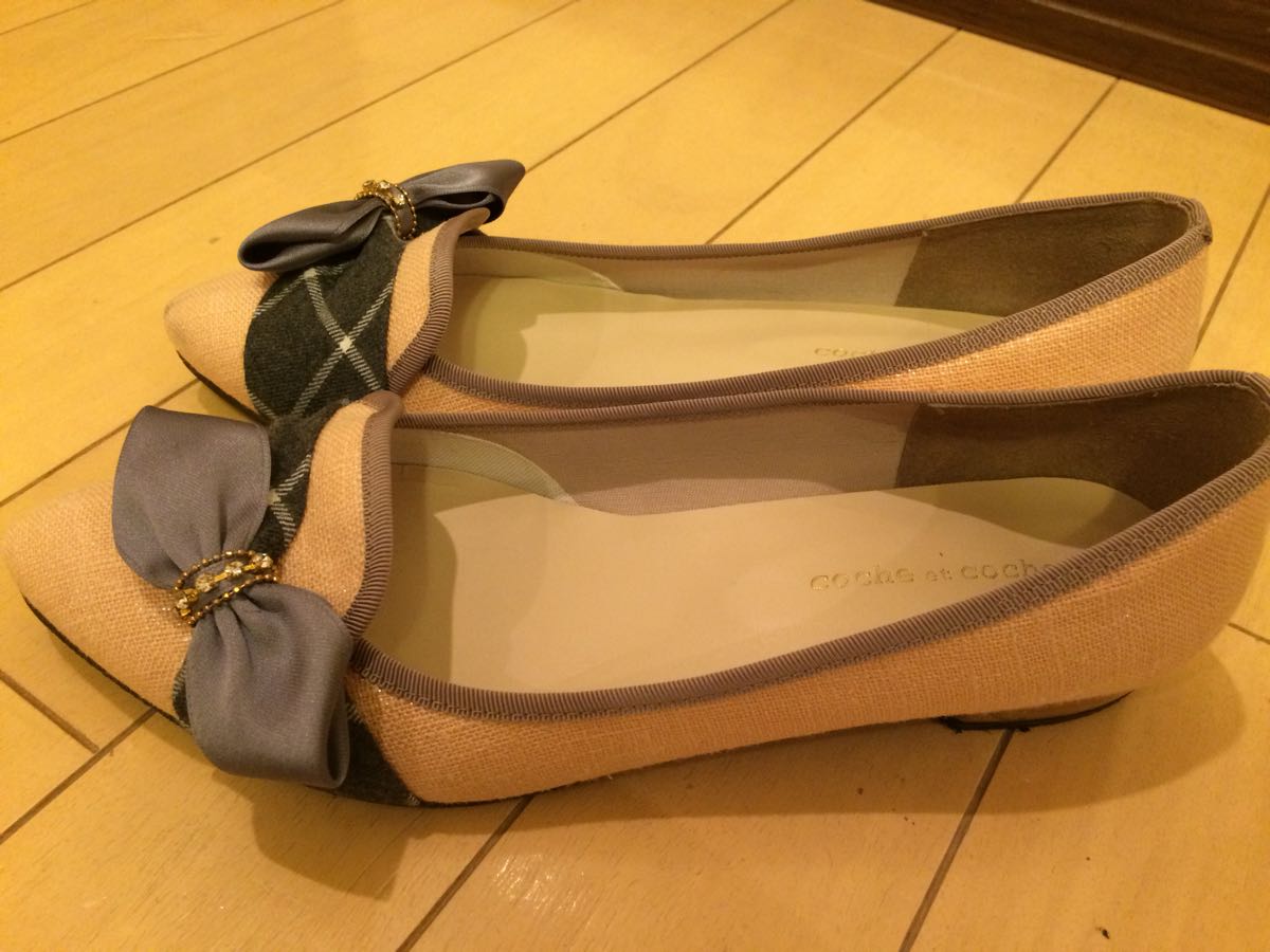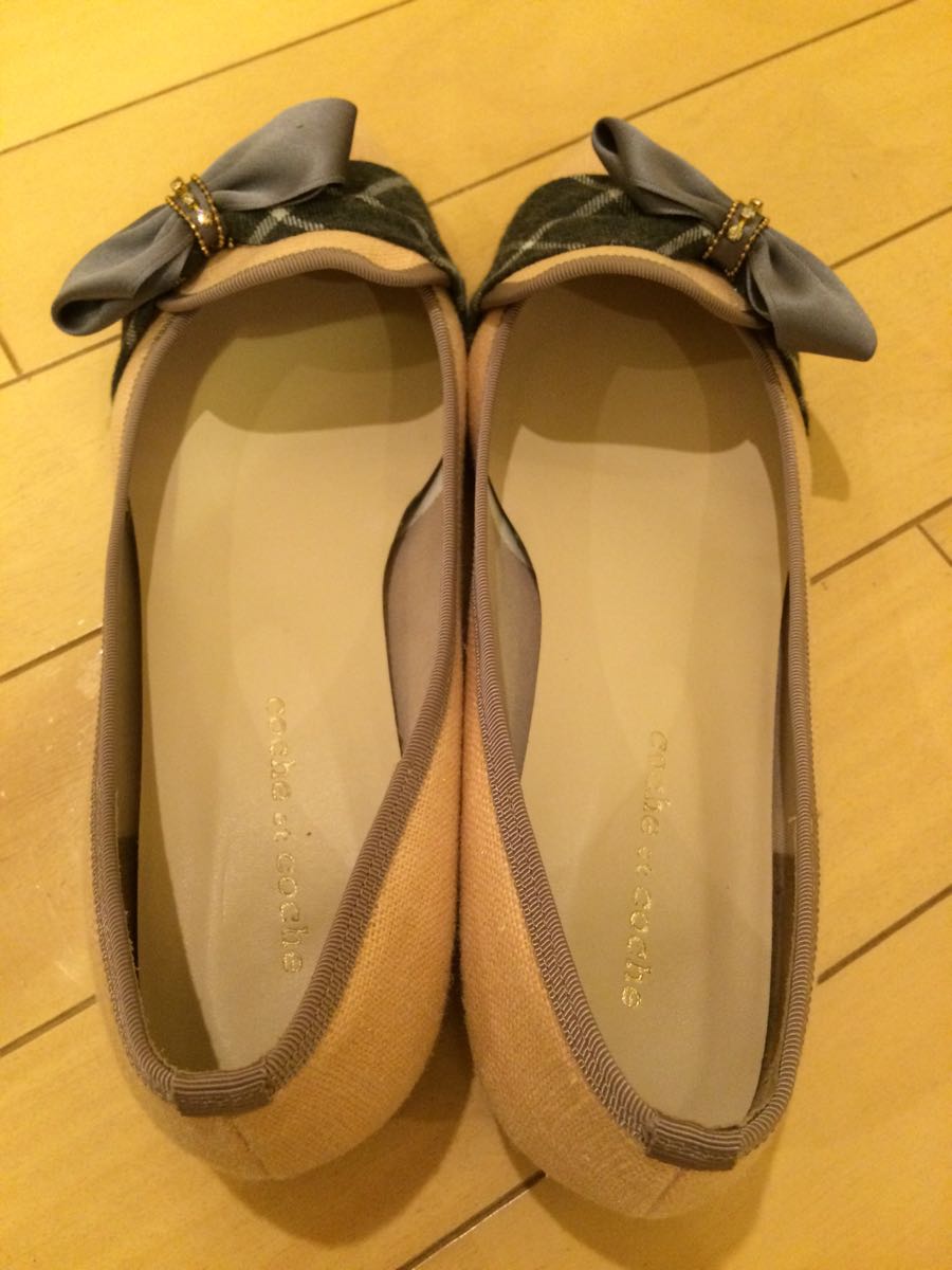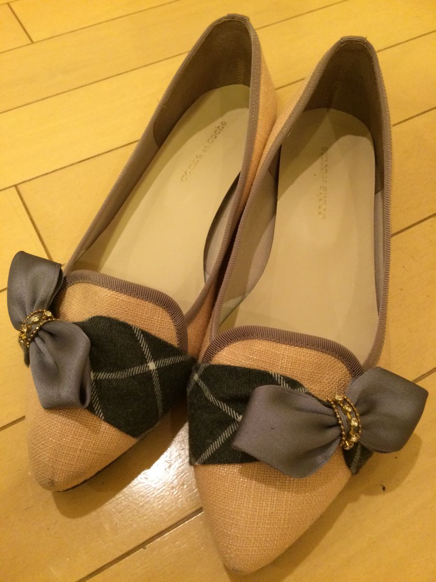 ◆ピンクベージュ×グレーリボン 布製パンプス 24cm◆