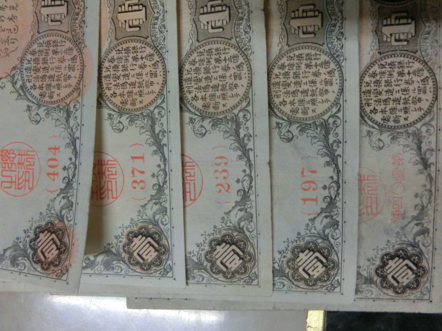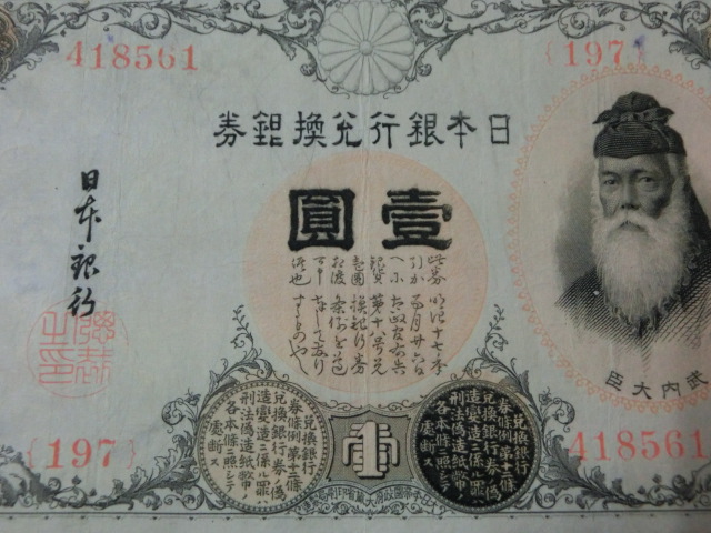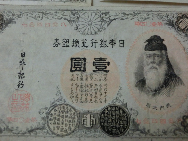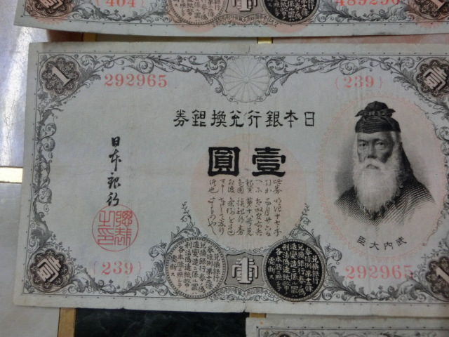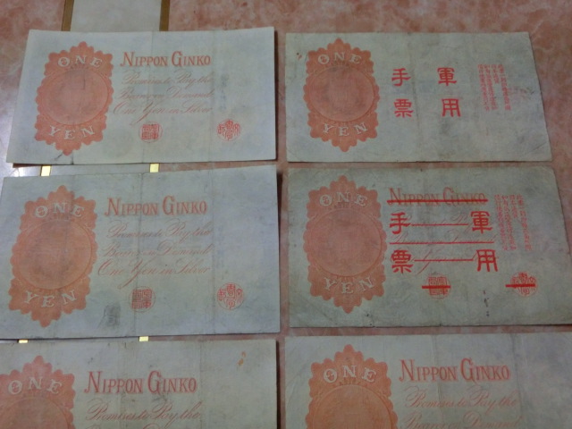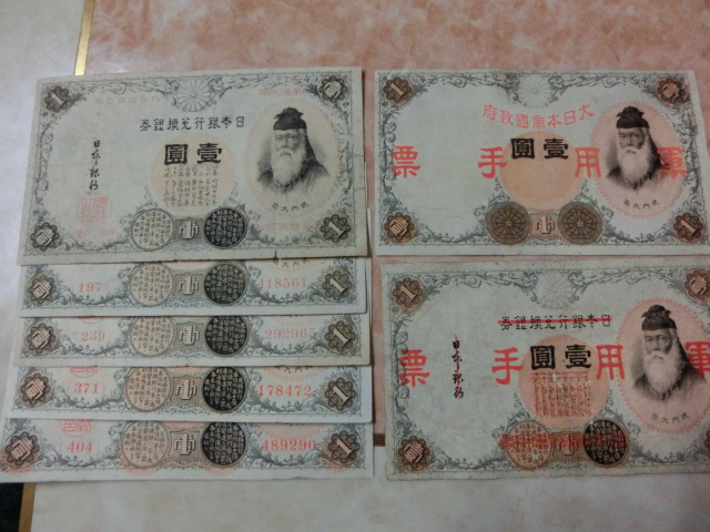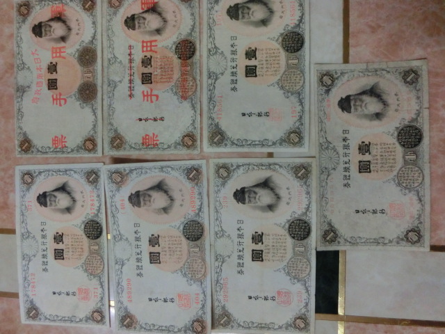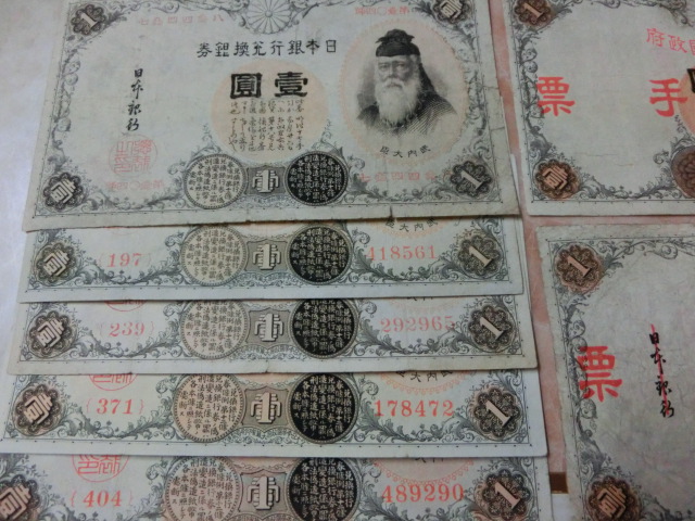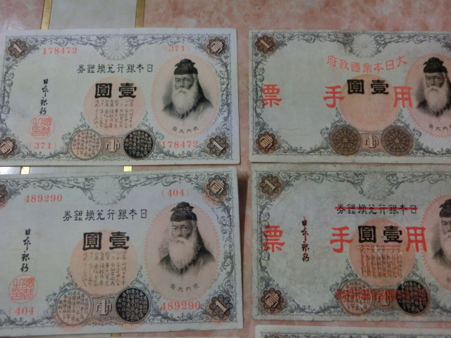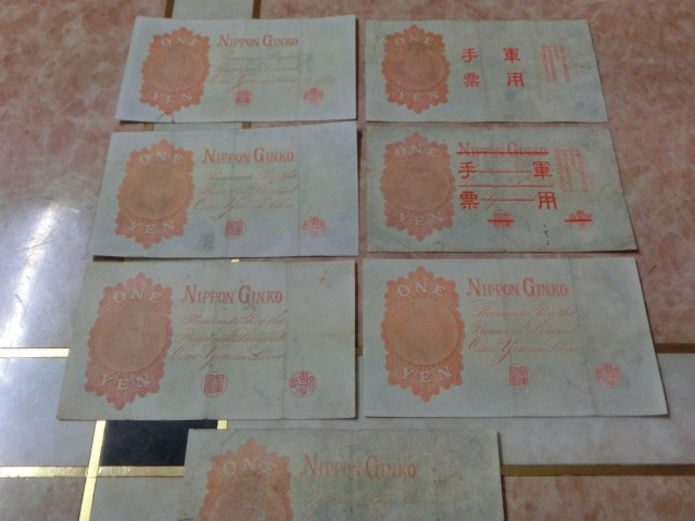 改造兌換銀行券1円 漢数字1円・大正兌換銀行券1円 アラビア数字1円(100番台・200番台・300番台・400番台)・日華事変軍票 乙号1円・日華事変軍票 丙号1円(少しツギ有り)の全シリーズ7種7枚セットです。