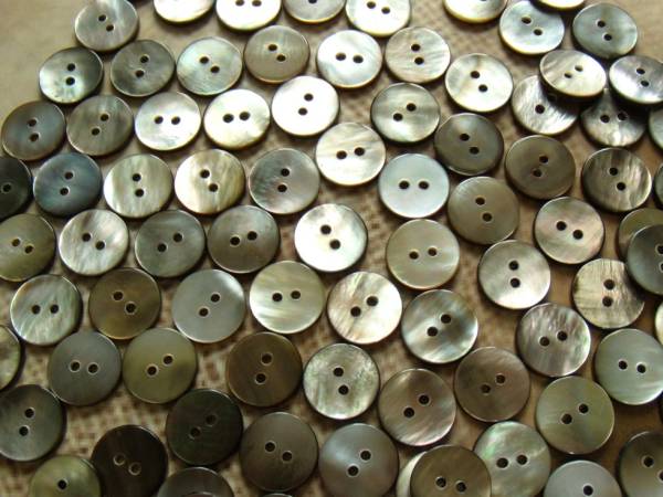 | ★商品説明★ | 非常に使いやすい まっ平らな型のボタンです。 洋服のボタン変え、趣味の手芸にと、大活躍な形です。 9mm. 10mm. 11.5mm. 13mm. 15mm. 18mm. 20mm. 23mm のサイズがあります。 「貝 ボタン まっ平ら」 で検索してください。 黒蝶貝は、古くから工芸、装飾に利用されてきた伝統的な素材です。 貝殻内側の虹色光沢の部分(真珠層)を切り取り、また削りだして使います。 木製品の象嵌(ぞうがん)細工や漆の螺鈿(らでん)細工のほか、 高級腕時計の文字盤や、指輪、ネックレス、カフスなど 装身具などにも使われます。 とても上品な黒銀色ですが、見る角度や光の加減で微妙に色が変化します。 天然素材ならではの奥深い味わいを、ぜひお楽しみください。 | ||