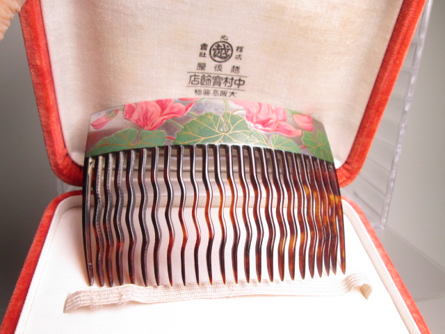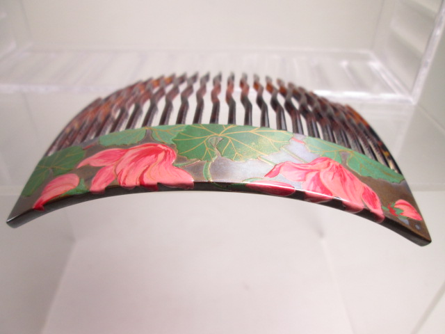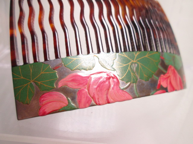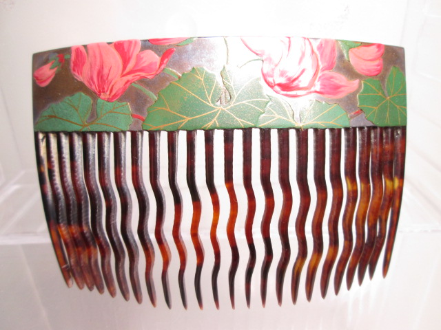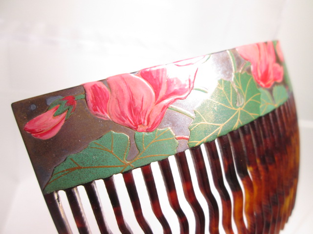 【江月】☆アンティーク・泉石作 本鼈甲 シクラメンの花 銀蒔絵の櫛 共ケース付