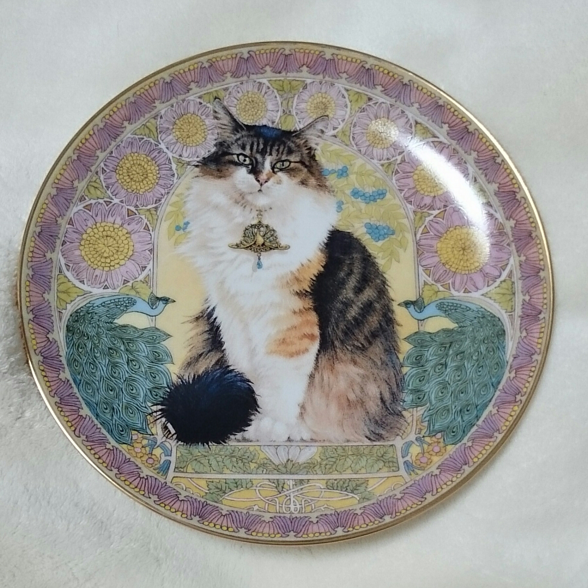 長毛の三毛猫がデザインされた美しいお皿です。