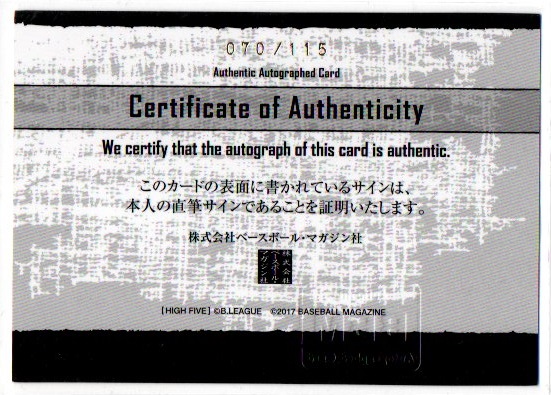 【小淵雅/群馬クレインサンダーズ】BBM×B.LEAGUE 2016-17 season -HIGH FIVE- 直筆サインカード 070/115 【Bリーグ】