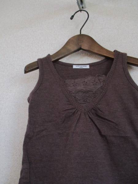| 商品紹介 | 襟周りと胸、裾にレースが付いたノースリーブです。 色は茶色で、両横の裾に6cm程スリットが入っています。 《素材》 本体:綿60% ポリエステル40% レース部分:綿100% |
