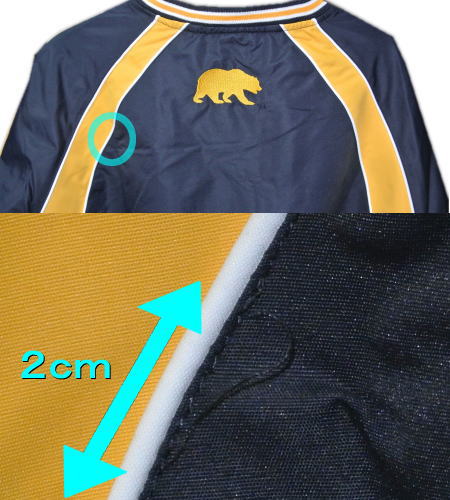 フロントの大学名、チームロゴ、うなじのマスコットは、パッチワークです。