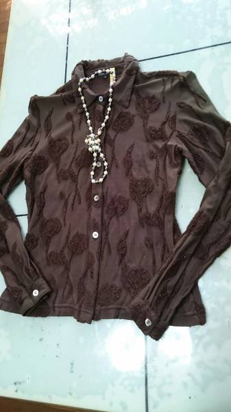 こげ茶 刺繍風 ストレッチが少しきいたトップスです。サイズ36 ウエスト部が絞ってありスタイルよく着ていただけるかと思います。