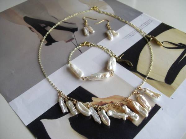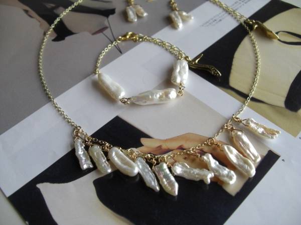 女の子らしさを+して・・シリーズです♪パール物語・・繊細な淡水ビワパールのネックレスとブレスレット、ピアスの3点セットです♪華奢なチェーンを合わせて可憐な表情です♪ネックレスは16+7ミリ位のクレオデザインのビワパールです♪長さは50センチ+アジャスター10センチで最長60センチ位です♪ブレスレットは22+8センチ位のビワパールです♪長さは17センチ+アジャスター6センチで最長23センチ位です♪ピアスは14+8センチ位のビワパールです♪長さは5センチ位です♪イヤリングにも変更出来ます♪それぞれ単品でも出品しています♪ハンドメイドをご理解頂いてノークレーム、ノーリターンでお願いします