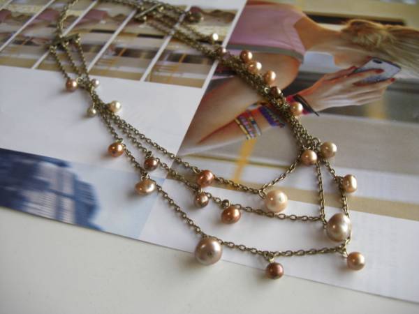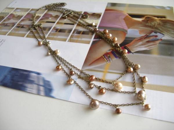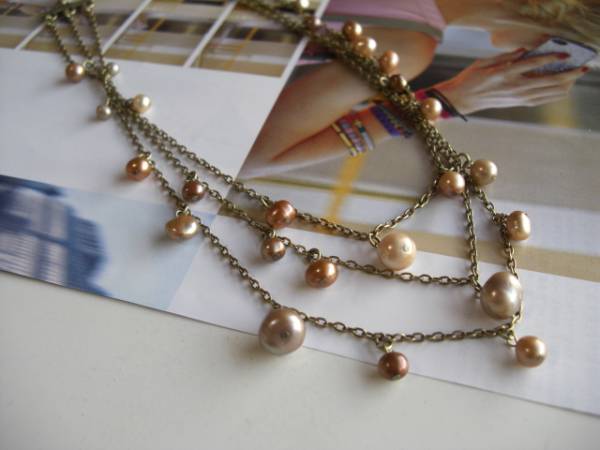 私的・クローゼット・・シリーズです♪秋色のパール・・シックな3連の淡水パールのネックレスです♪3ミリから9ミリ位までのポテト、バロック、芥子などデザイン違いの淡水パールを3連のチェーンに繋ぎました♪ベージュやシャンパンゴールド、ダークベージュなどシックなお色が大人っぽい表情です♪長さは全長72センチ位で調節自由です♪チョーカー風にされても素敵です♪お揃いのブレスレットも出品しています♪シンプルで飽きのこないいつまでも着けられるデザインを考えて作りました!ハンドメイドをご理解頂いてノークレーム、ノーリターンでお願いします