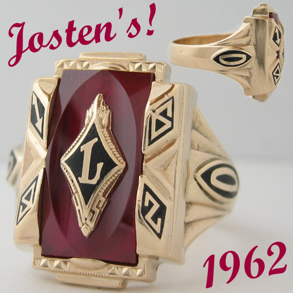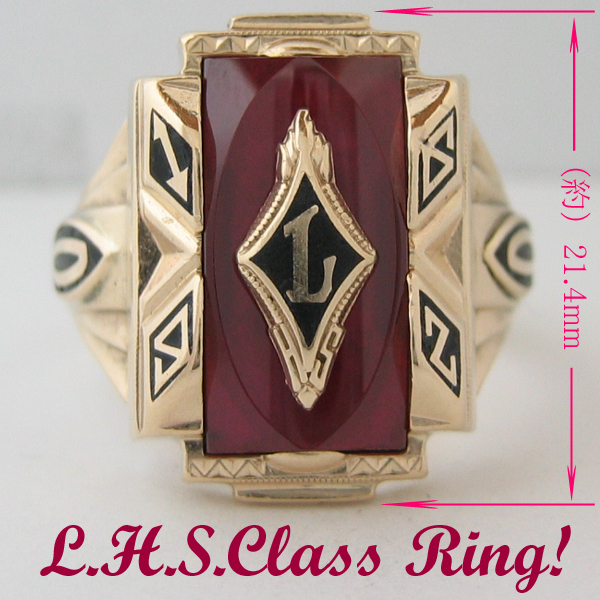 ♪ USAカレッジリング、トップブランド、ジャステンス社製のクラスリング。ルビーレッドカラーストーン使い。年号部は菱形を左右対称に配したお洒落なアートデザイン。内側にブランド刻印、 JOSTEN 10K 等あり。画像をご覧頂けます様に目視レベルで石に大きく目立つキズ等も見られず60年代初頭のUSED品としてはグッドコンディション。流行の1960年代ヴィンテージ!正面縦幅(約):21.4㎜とフェースサイズの大きなクールなリングです!aikoさんもお気に入り、お洒落な、ヴィンテージ カレッジリング!!