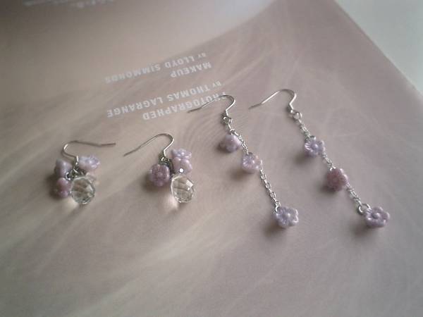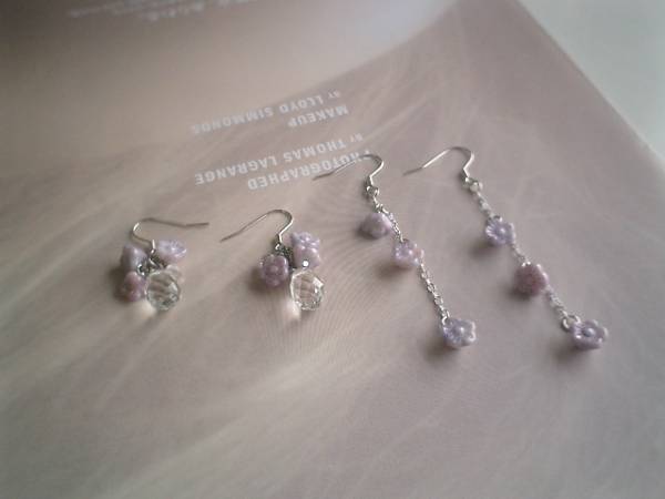 私らしさのスパイス・・シリーズです♪可憐な水晶と小花・・繊細な水晶に淡い紫のチェコの小花を合わせてロマンチックなピアス2組です♪デザイン違いのペア2組セットです♪色々な組み合わせで楽しんでいただけます♪長い方のピアスはチェコの小花を繊細なチェーンに散らして可憐な表情です♪長さは全長8センチ位です♪短い方のピアスは13×9ミリのドロップカットの水晶にチェコのお花を合わせました♪長さは全長4センチ位です♪イヤリングにも変更出来ます♪それぞれ単品やお揃いのネックレスやブレスレットも出品しています♪シンプルで飽きのこないいつまでも着けられるデザインを考えて作りました!ハンドメイドをご理解頂いてノークレーム、ノーリターンでお願いします