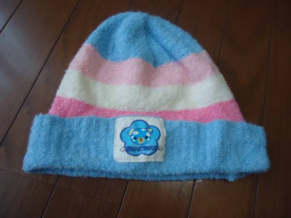 パステル系のお色の可愛い帽子です。クマちゃんのワッペンがワンポイントです。とても柔らかく、しなやかで伸びる素材なので、着用し易いと思います。中古品ですが、シミ汚れもなく美品です。