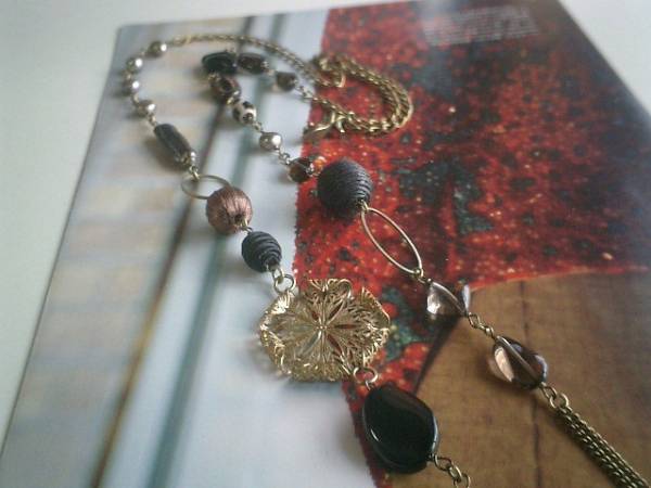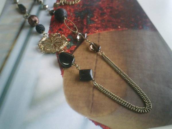 パンク・ガール・・シリーズです♪秋色のモチーフ・・黒、ブラウン、グレーなどのオニキスや淡水パールやサテンボール、巻きビーズや透かしチャームの異素材を集めてロマンチックなネックレスです♪12ミリから18ミリ位までのスクエアやオーバルのオニキスやパープルグレーの淡水パールやコイン、スクエア、オーバルのスモーキークォーツやシェルリング、サテンボールや透かしチャームのネックレスは全長92センチ位で調節自由です♪2連にされても素敵です♪お揃いのネックレスやブレスレットも出品しています♪シンプルで飽きのこないいつまでも着けられるデザインを考えて作りました!ハンドメイドをご理解頂いてノークレーム、ノーリターンでお願いします