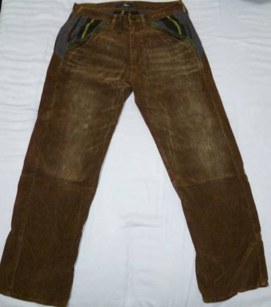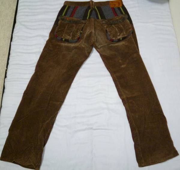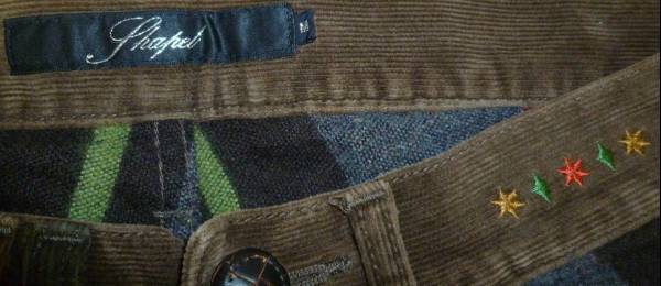 こげ茶のコーデュロイに、バックポケットの端、フロントのポケットの端、フロントのベルトループが違う色のコーデュロイで切り返され、腰の部分には星の刺繍、そしてウエスト部は異素材のストライプで切り返されています。フロントのボタンはくるみボタンになり、細かい所にまでこだわったパンツになります。