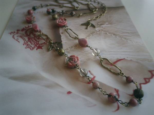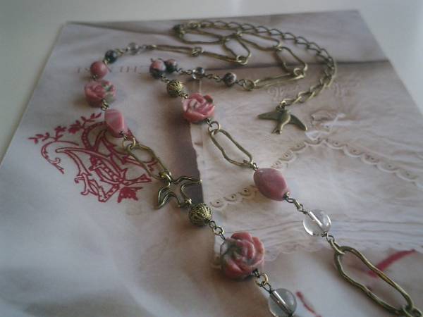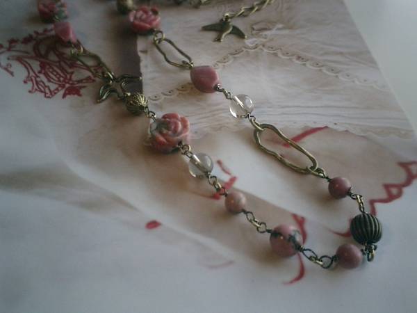 女の子モード・・シリーズです♪シックなピンク・・アンニュイなロードナイトのネックレスです♪丸玉やナツメカットや両面薔薇のロードナイトにスモーキークォーツの丸玉や透かしメタルや小鳥さんのチャームやデザインチェーンを合わせてロマンチックな表情です♪長さは全長90センチ位で調節自由です♪2連にされても素敵です♪同じデザインの長さ違いやブレスレットも出品しています♪ハンドメイドをご理解頂いてノークレーム、ノーリターンでお願いします