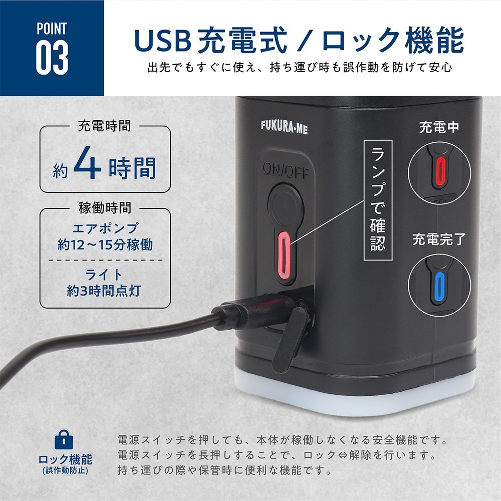 | 充電/稼働時間 | 約4時間充電(満充電)で エアポンプ:約12~15分稼働 ライト:約3時間点灯 |