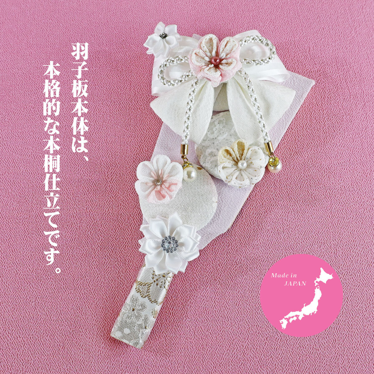 日本製摘み細工を使用した羽子板飾りです。