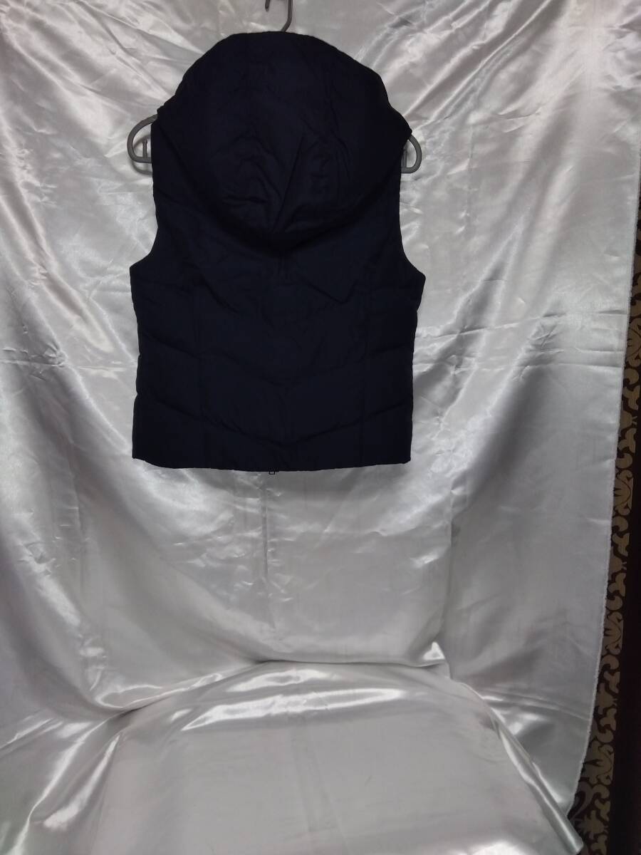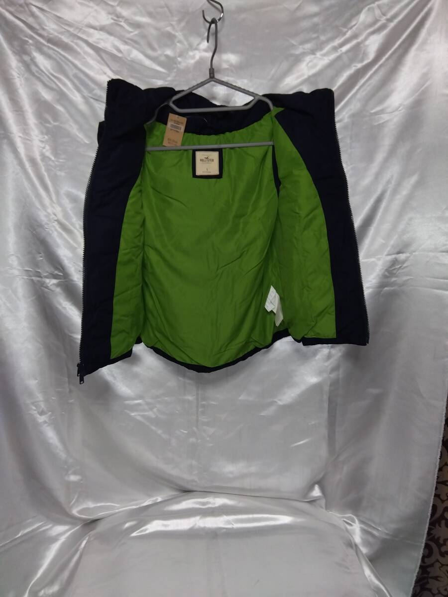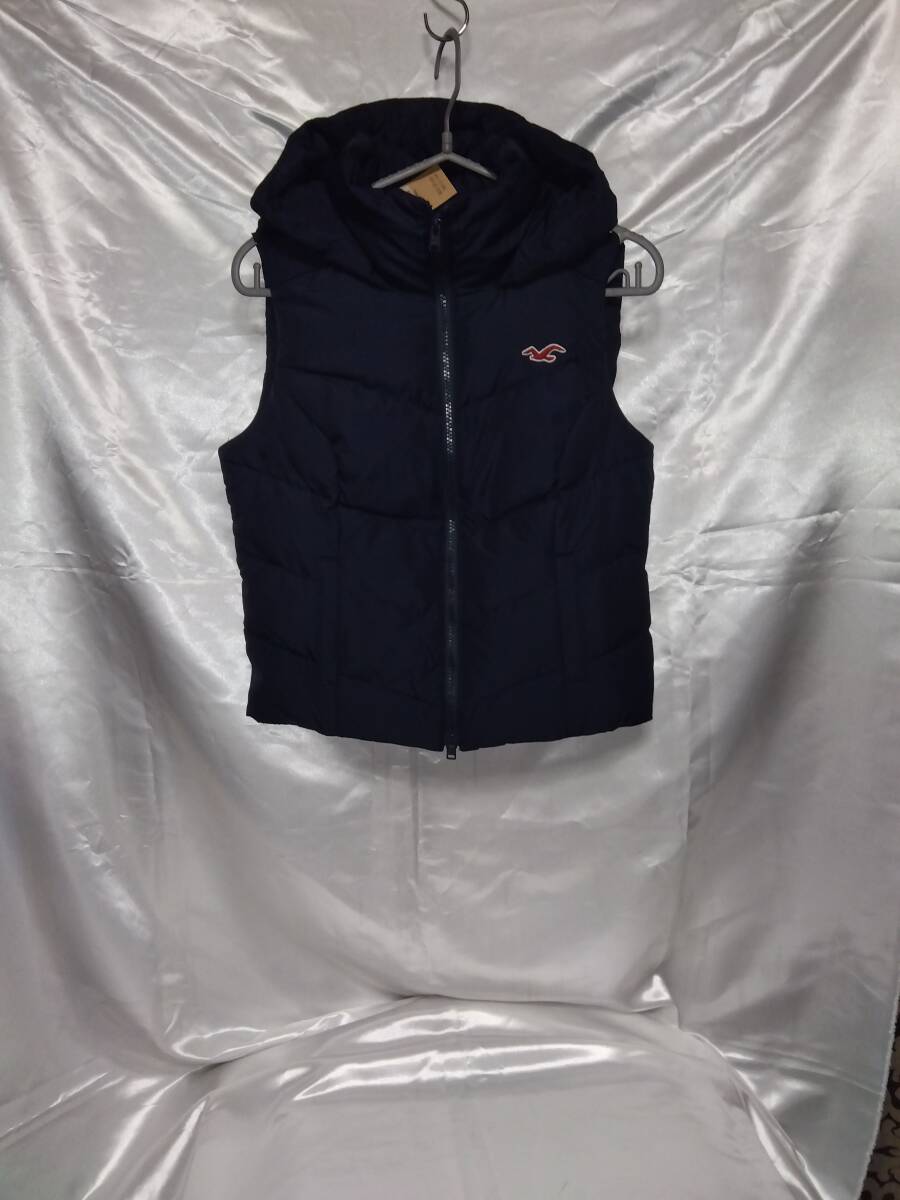 ホリスターレディースダウンベストフード付き 表ネイビー裏グリーン ポリエステル 100% ダウン50%フェザー50%フロントジッパーポケット2 着丈49cm肩幅36cmバスト42cm平置き採寸 タグ付き