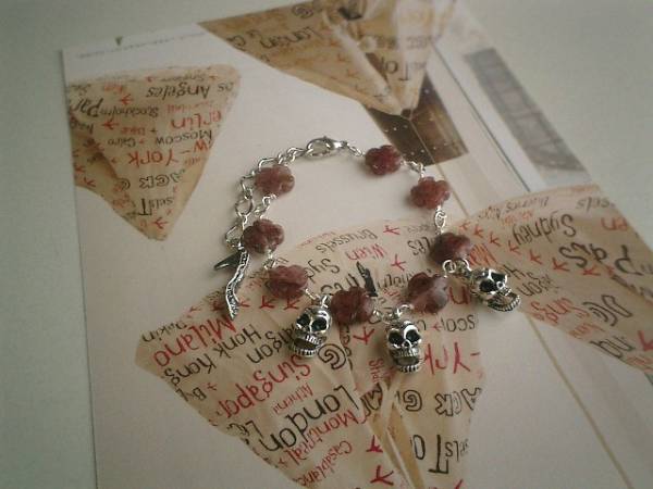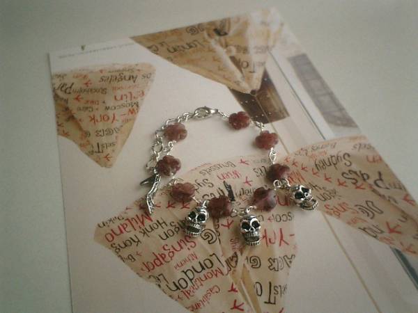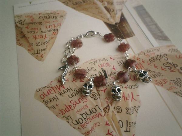 ジャンヌの幸せ・・シリーズです♪髑髏さんに恋して・・キュートな髑髏さんとモスコバイトのブレスレットです♪メタリックな髑髏にモスコバイトのクロスフラワーを合わせて可憐な表情です♪髑髏さんは15ミリ×9ミリ位、モスコバイトは10ミリ位です♪長さは全長23センチ位で調節自由です♪お揃いのネックレスやピアスも出品しています♪シンプルで合わせやすいデザインを考えて作りました♪♪ハンドメイドをご理解頂いてノークレーム、ノーリターンでお願いします