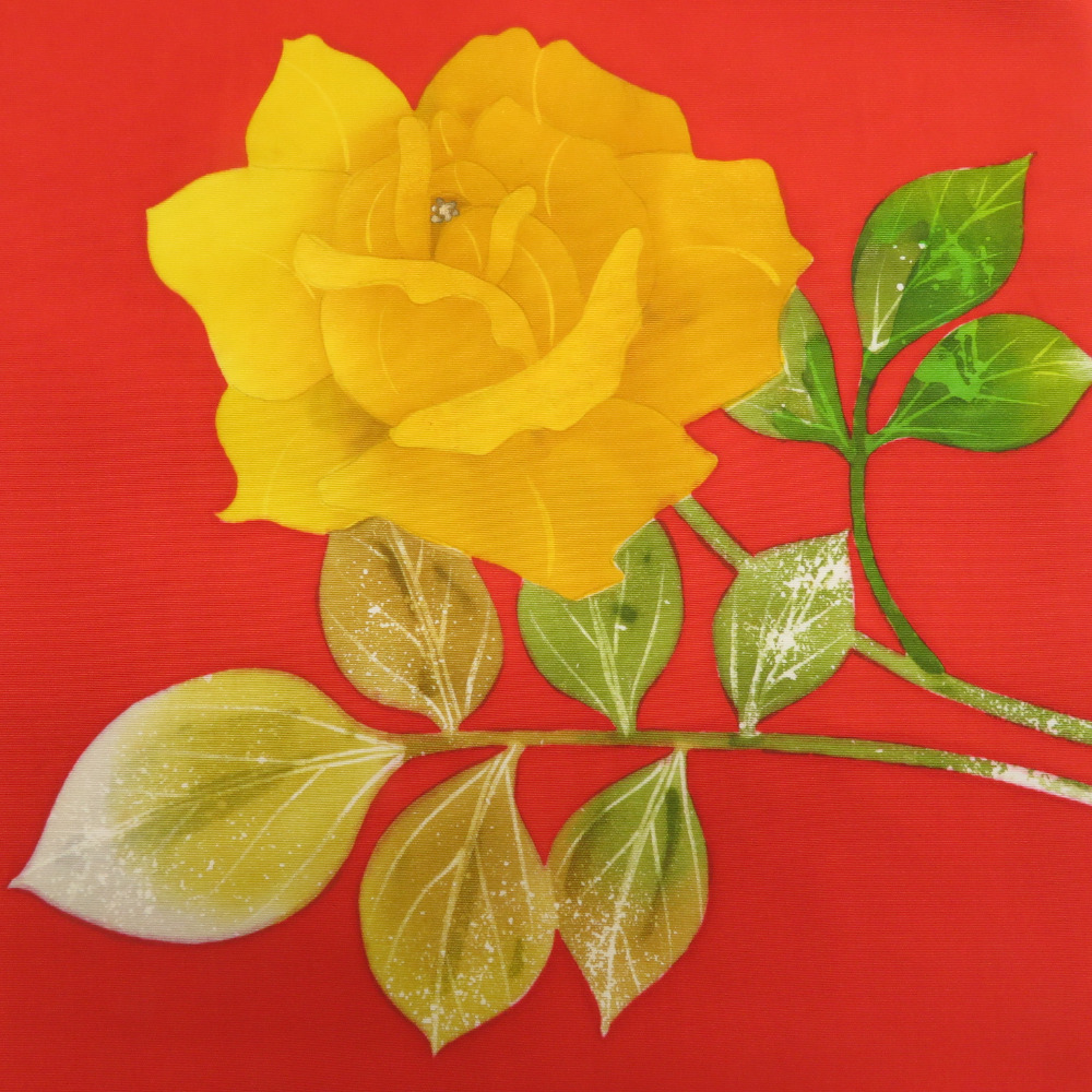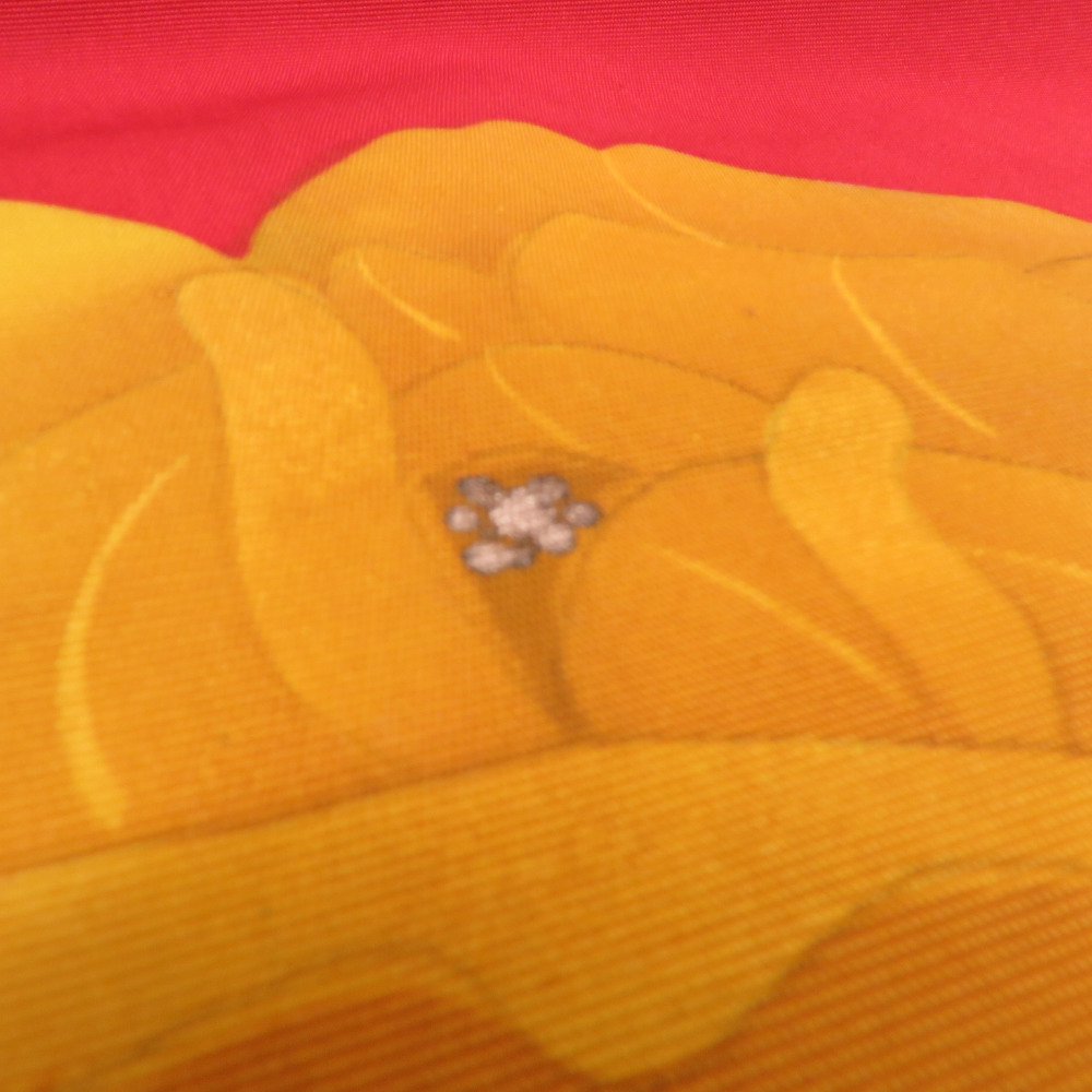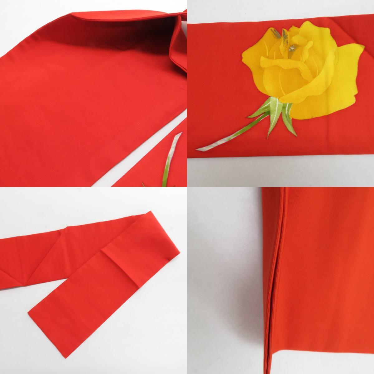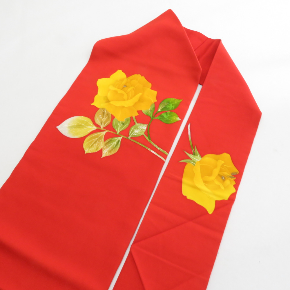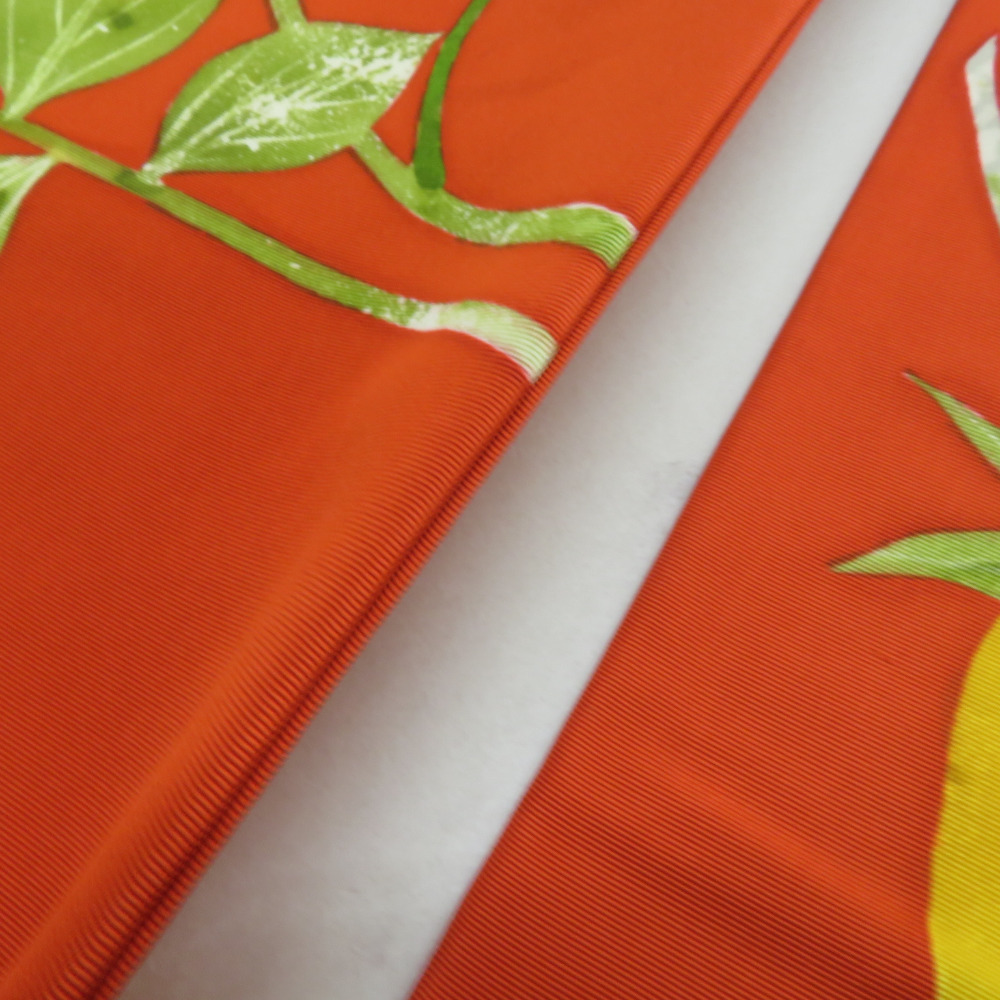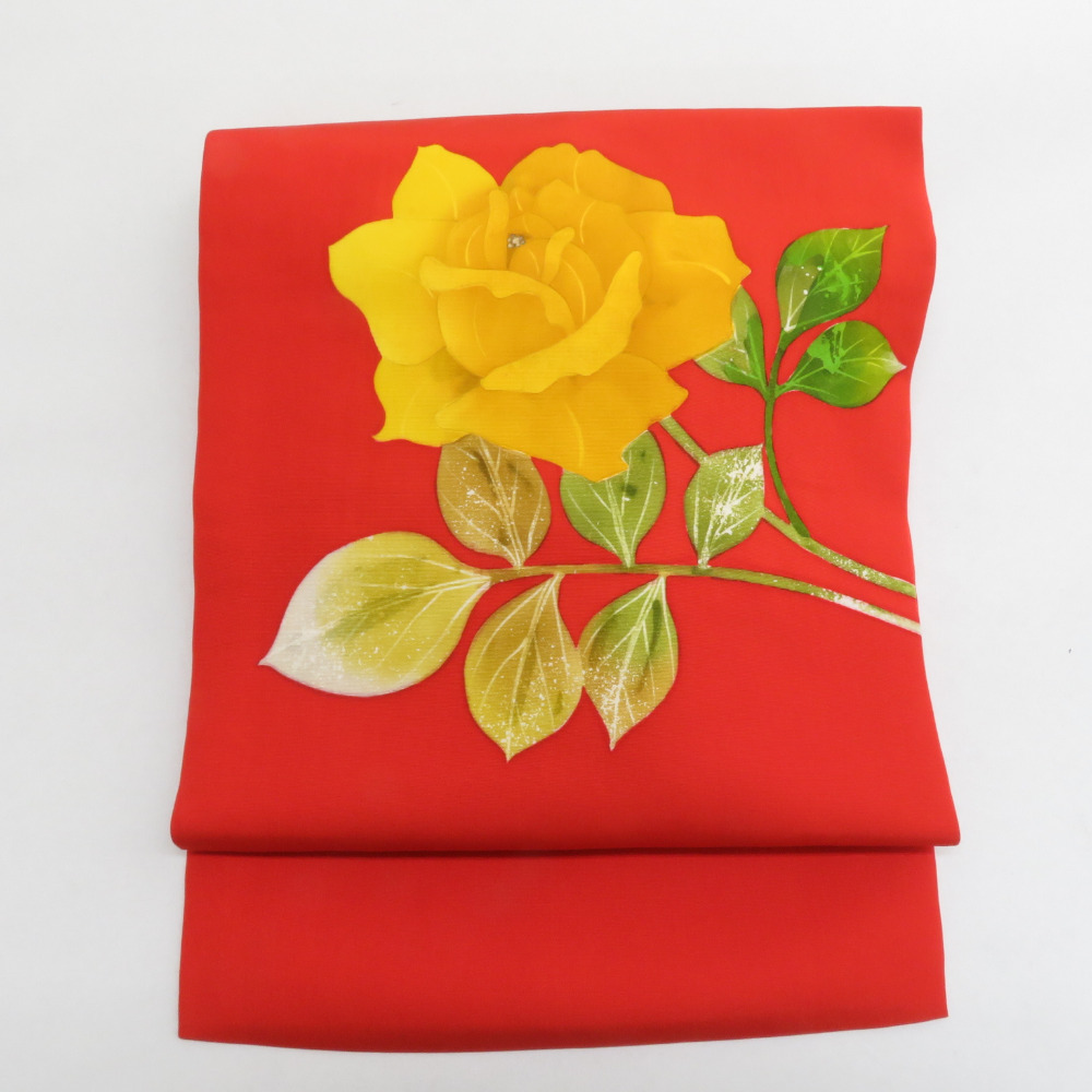 | 名古屋帯 正絹 塩瀬 オレンジ色x黄色 薔薇文様 お太鼓柄 カジュアル 仕立て上がり 着物帯 長さ352cm |