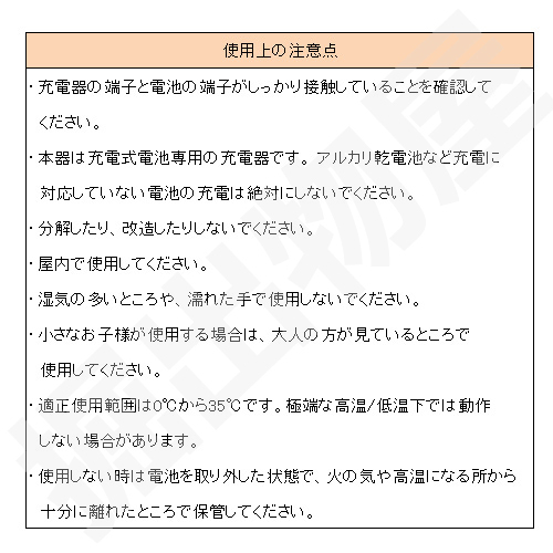 ・本商品は充電式電池用の充電器です。その他の電池を充電すると故障の原因となります。