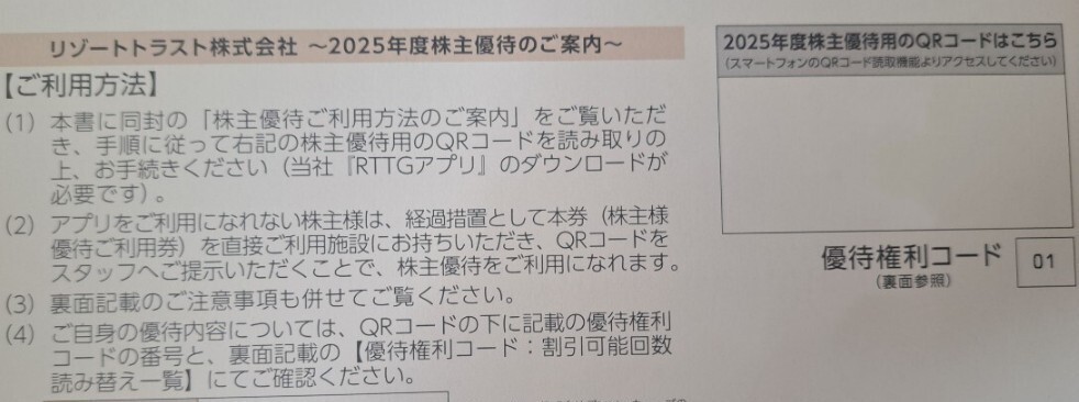 リゾートトラストの株主優待券1枚です。3割引です。