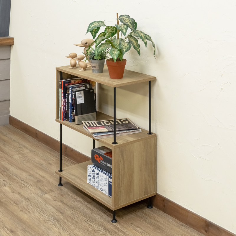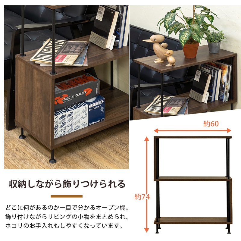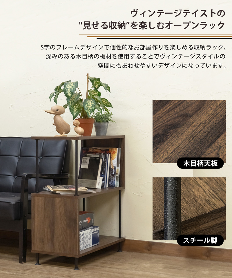 | 商品説明 | 組立品(30分) ※工具不要 S字型の個性的な棚板でお部屋をおしゃれに飾り付けられるオープンラック3段。 ヴィンテージスタイルの空間にもあわせやすい深みのある木目柄の板材を使用しています。 スリムなスチールフレームとヴィンテージテイストの木目柄天板を組み合わせた、 風通しがよく"見せる収納”を楽しむことができるオープンラック。 S字型の左右非対称なデザインでお部屋を一段階おしゃれに飾り付けることができます。 工具は不要。スチールフレームと板材をはめこむだけの簡単組み立てで女性の方も安心です。 |