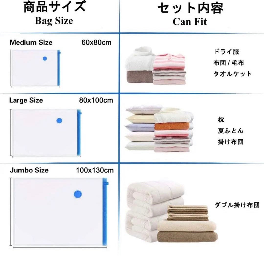 洋服/布団/ふとん圧縮袋になります。 内容 ◆2XL:110*90*45*2枚 材 質 圧縮袋:ポリエチレン・ナイロン スライダー:ポリプロピレン 【使用方法】 STEP1:収納物を充分に乾燥させて、大きさに合わせ畳んでから圧縮袋に入れる。 STEP2:圧縮袋を平めて、中の空気を排出する。 STEP3:チャックを止めてからスライダーを左から右へスライドすると密閉できる。空気漏れを防ぐため、繰り返しスライドしてください。 STEP4:バルブの蓋を回しながら開けて、手動ポンプまたは掃除機をご使用頂き圧縮袋中の空気を排出する。 STEP5:圧縮袋中の空気を排出した後、圧縮袋のバルブを閉める。 STEP6:家に掃除機があったら、掃除機のホースの先をバルブに垂直にあてて、吸引を始め、圧縮が終わりましたらホースをバルブから離すだけで完了です。 ※ ご注意:ごバルブの中に空気漏れ防止の透明のシリコンは絶対抜かないでください。 【注意事項】 1.ご使用の前に衣類などを十分に乾燥してください。革製品と食品は袋に入れないでください。 2.できるだけ袋の奥まで入れて、せめてスライダーのファスナーから何センチの距離を残してください。 3.密封性を保証するために、スライダーを繰り返して開け閉めてください。 4.バルブの中に空気漏れ防止のピンク色のシリコンがあるので、是非抜かないでください。 5.乳児や幼児の手の届かない場所に保管してください。袋をかぶって窒息するなどの危険性があります。本品は衣類を圧縮収納するための袋です。用途以外の目的で絶対に使用しないでください。 6.熱や火にを避けて、釘・針・刃物等で傷つけないでください。