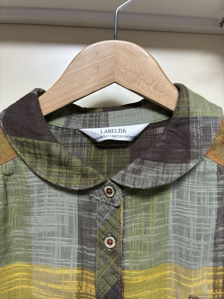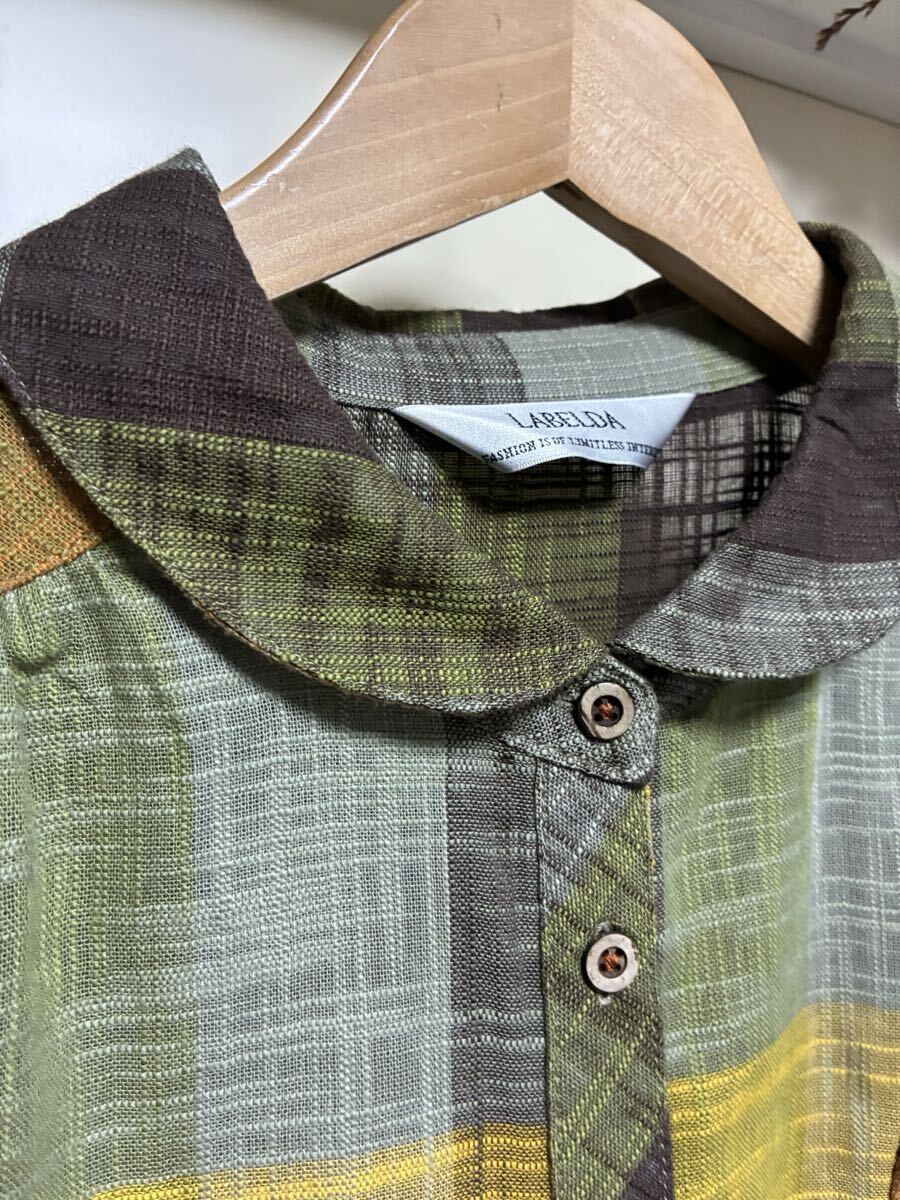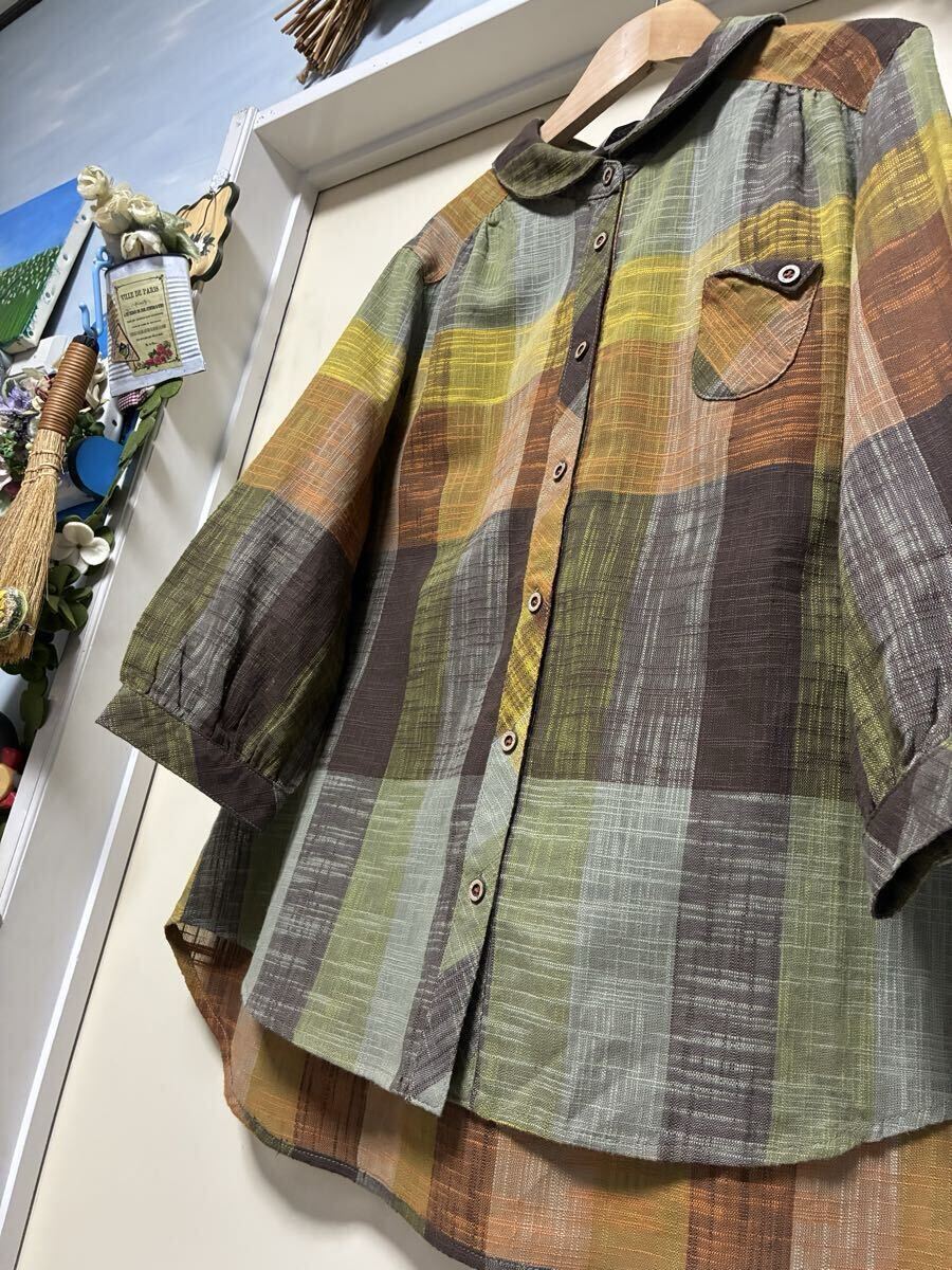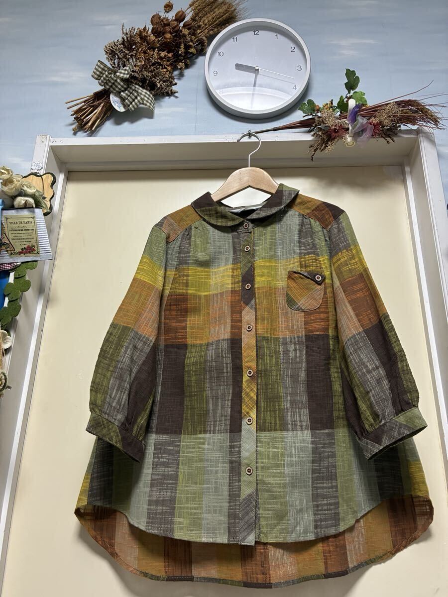 ★LABELDA★大きいサイズ★落ち着きのある色合いのチェック柄で胸元のポケットがお洒落な揺ったりブラウスになります。ブラウン系を基調とした色合いのチェック柄で襟はちび丸襟で前中心はボタンになっています。左側の胸元には小さなポケットが付いています。両肩や後ろ側の背中辺りにはギャザーが入っています。裾辺りの両サイドは緩やかなカーブを描いていて着丈は後ろ側がやや長めになっています。揺ったりとしたお洒落な一枚に仕上がっています。