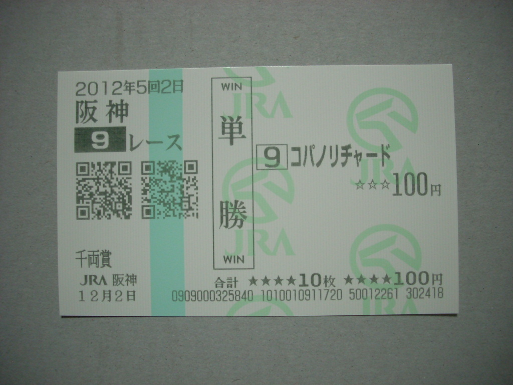 ■コパノリチャード:千両賞(500万下) 現地。ハズレ馬券。代理出品。年数が経っているので色あせ等がありますので、神経質な方はご遠慮下さい。画像で判断してください。ノークレーム・ノーリターンでお願い致します。 発送はミニレター・定形(普通郵便)を予定しています。