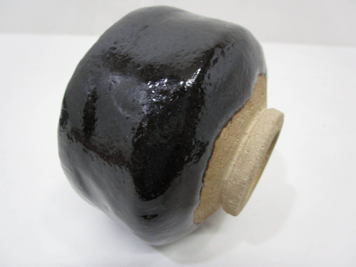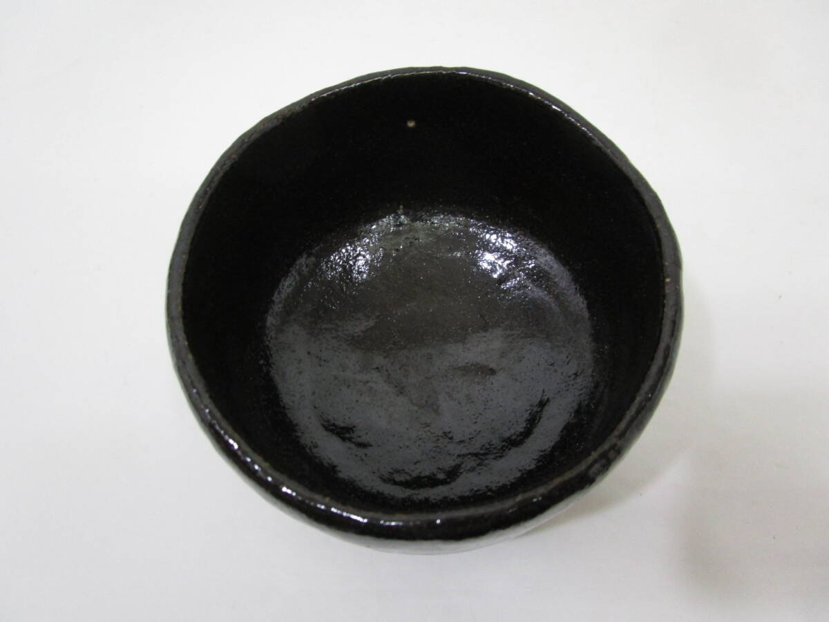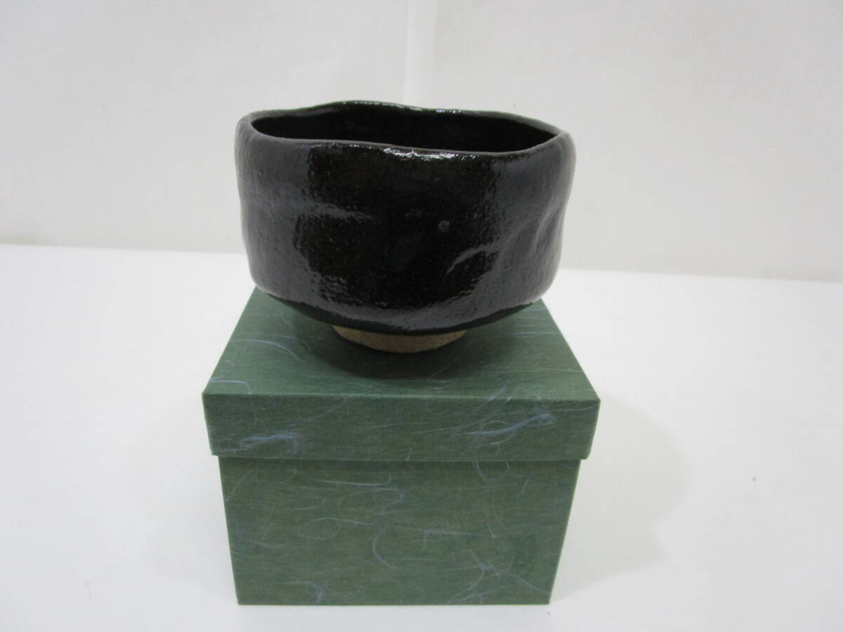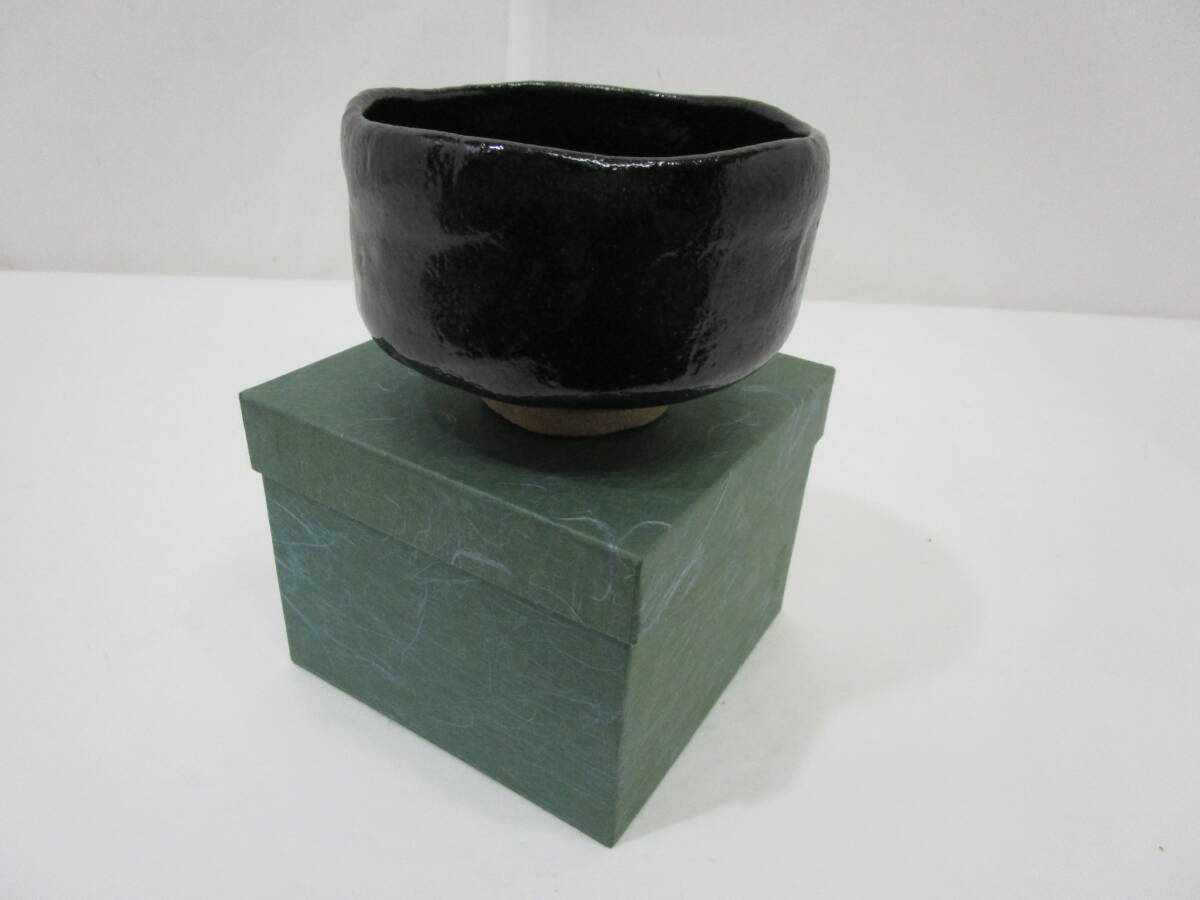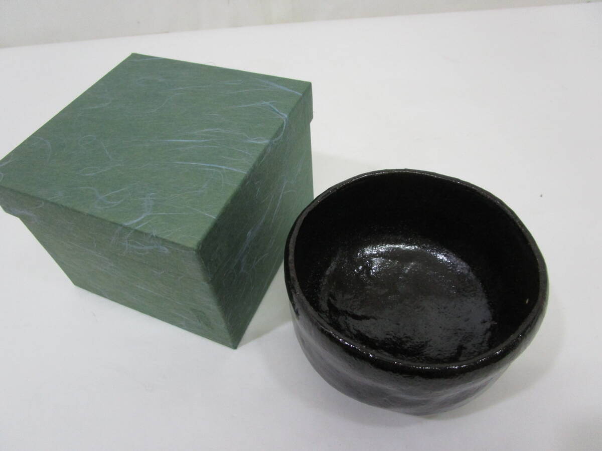 中古茶道具! 京焼 「窯元・短冊屋」 川崎和楽作の 黒楽 茶碗です。 胴径12cm 高さ 8.5cm 茶碗の高台に時代汚れが有ります。★ 内・外側にヤットコの挟み跡有り。作印有。 化粧箱。 どうぞ宜しく。