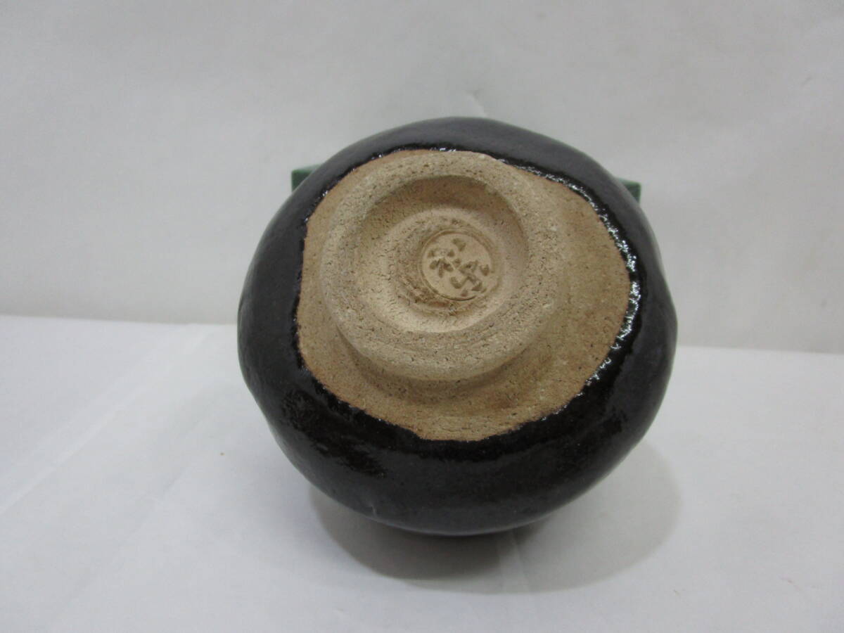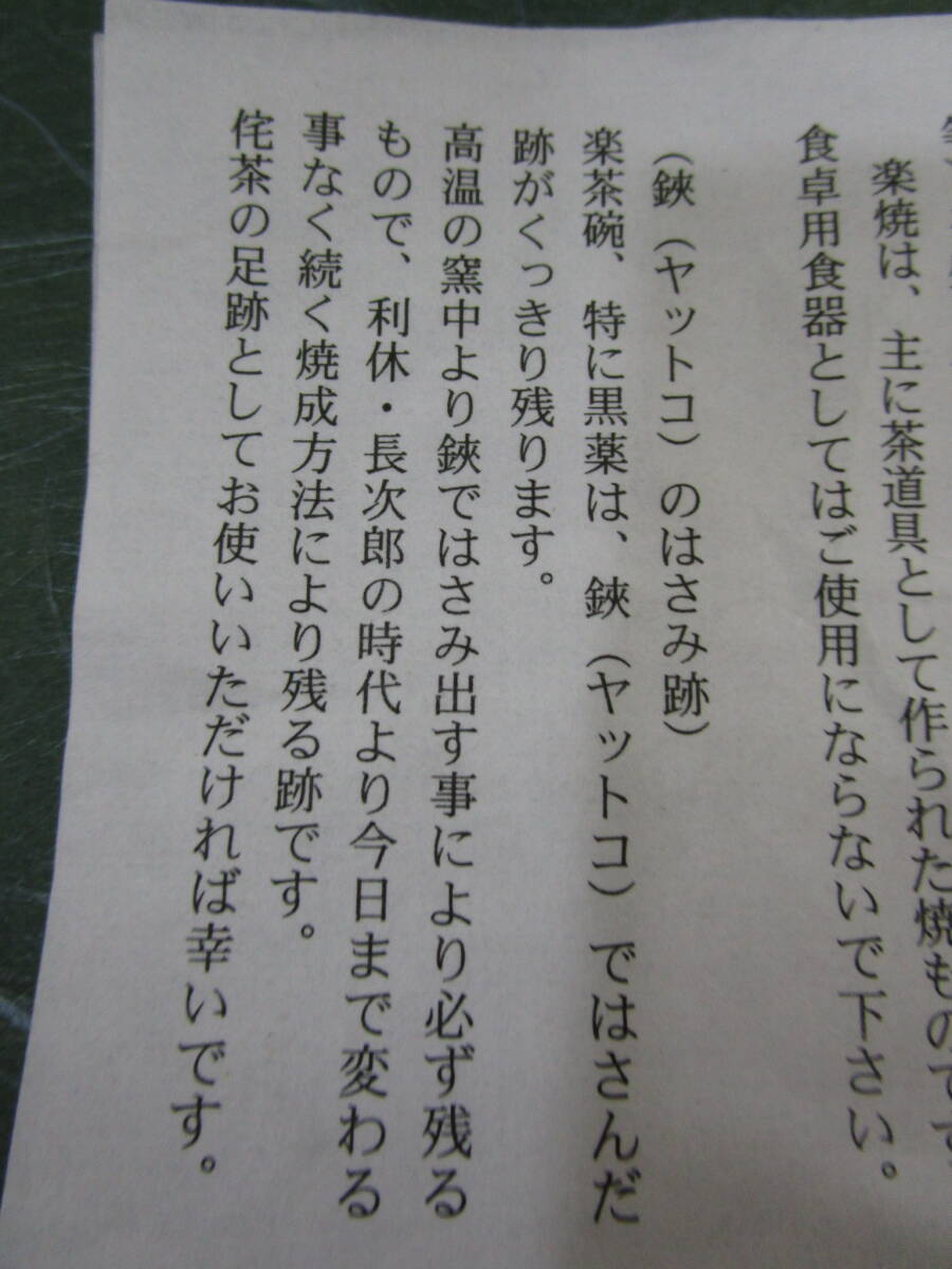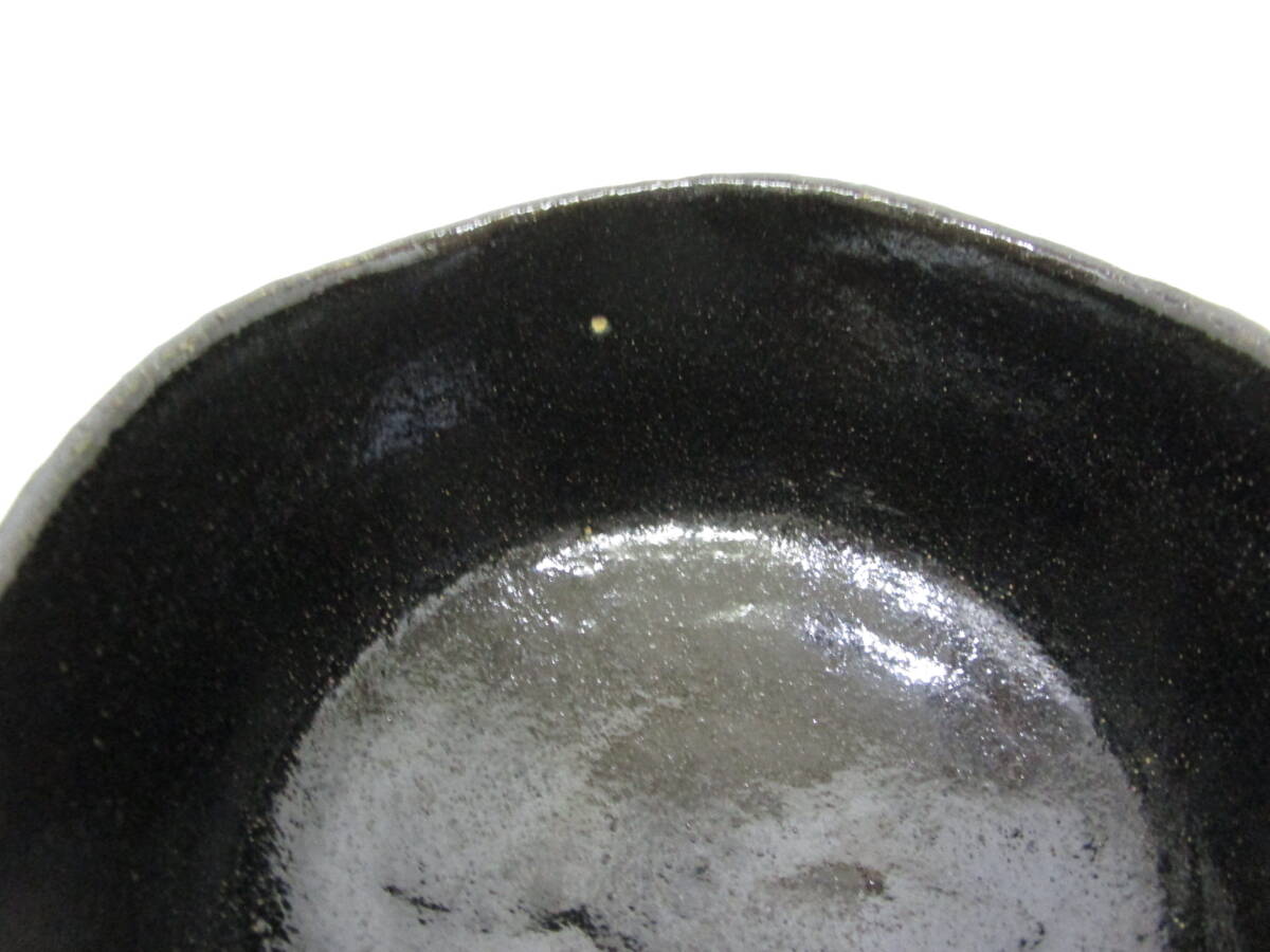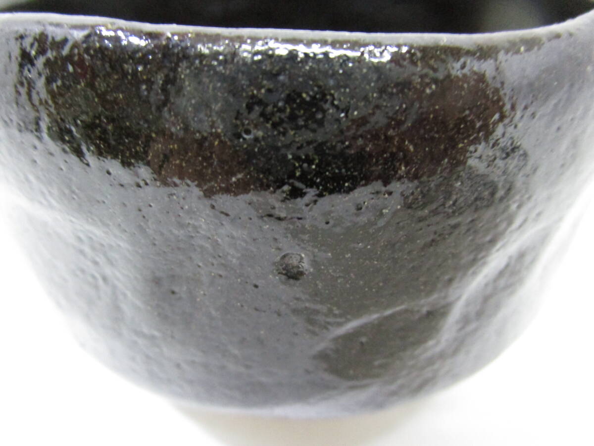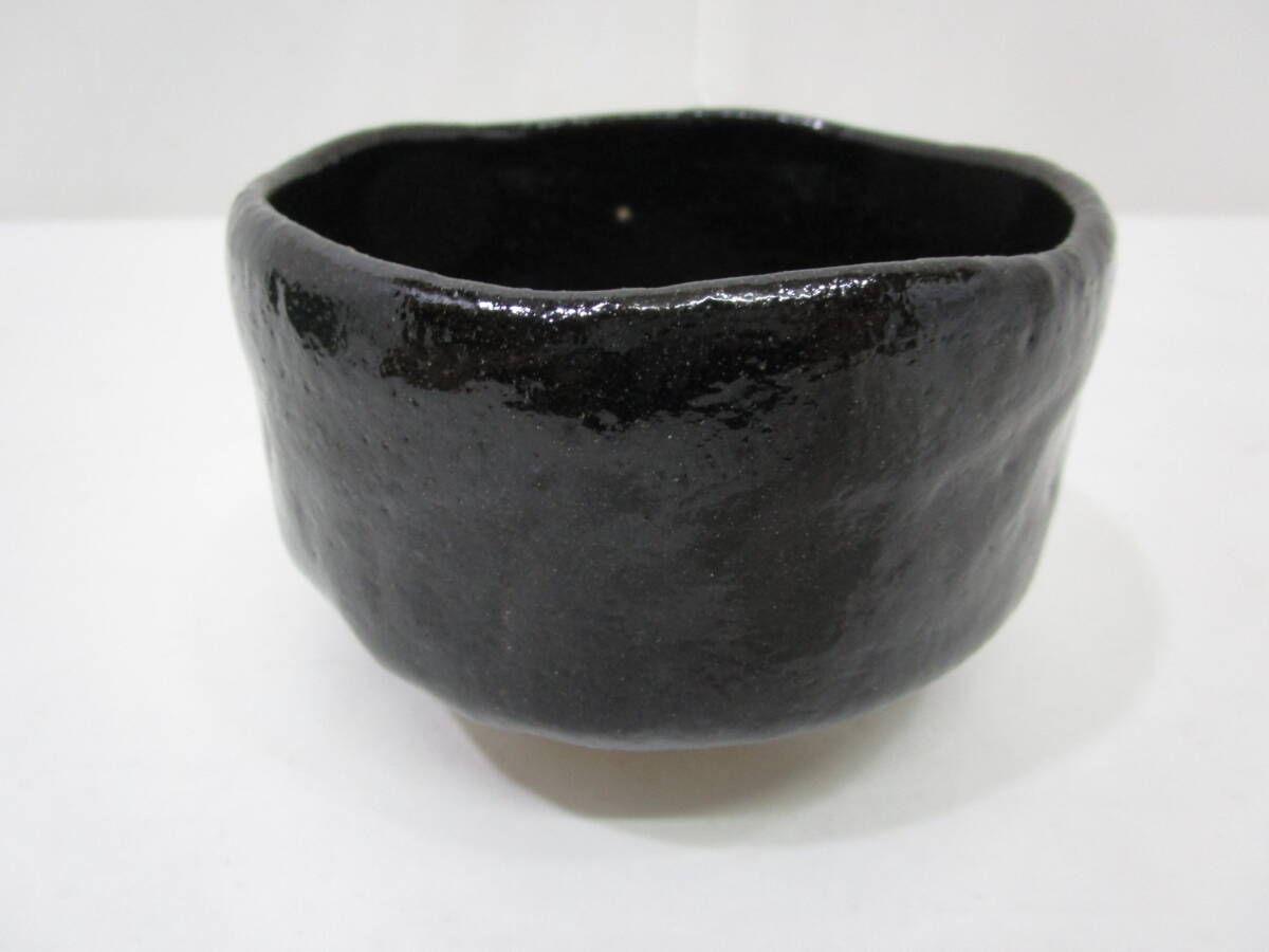 中古茶道具! 京焼 「窯元・短冊屋」 川崎和楽作の 黒楽 茶碗です。 胴径12cm 高さ 8.5cm 茶碗の高台に時代汚れが有ります。★ 内・外側にヤットコの挟み跡有り。作印有。 化粧箱。 どうぞ宜しく。