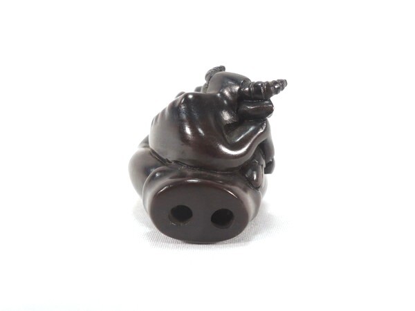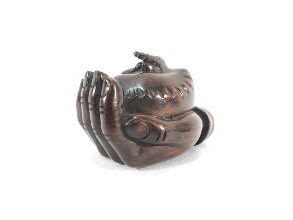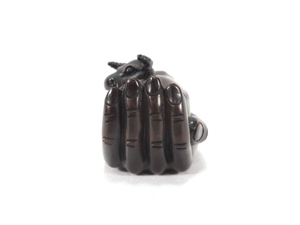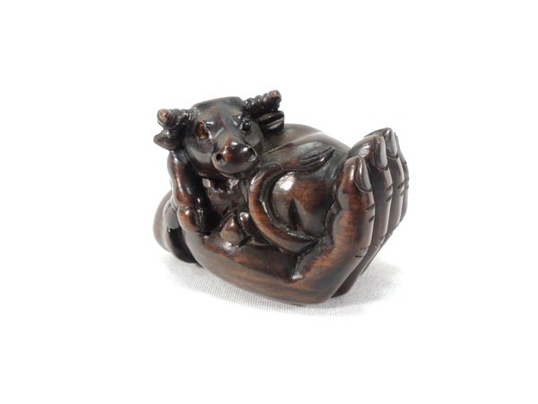 吉利銘  「手の平の牛」 木彫根付 になります。