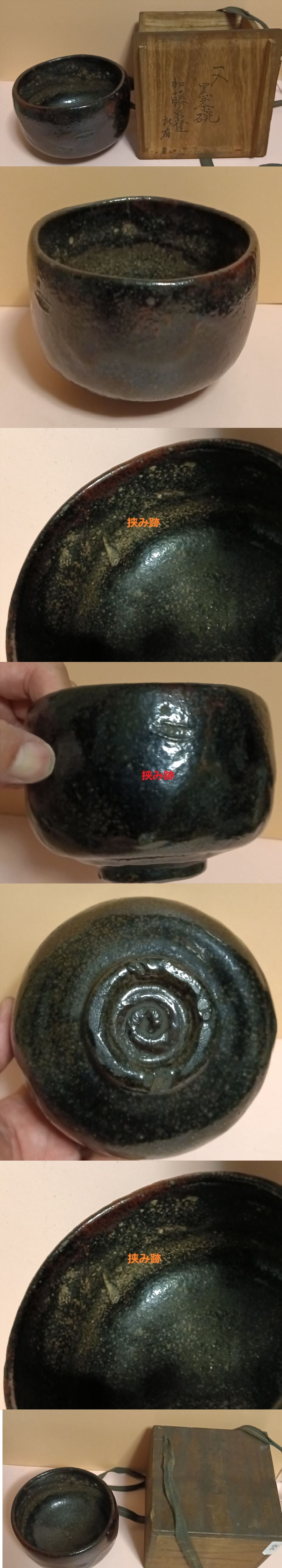 一入 黒楽 四代楽吉左衛門 茶碗 黒楽 一入特徴 ①挟み跡 ②黒釉から朱色釉変 収蔵箱