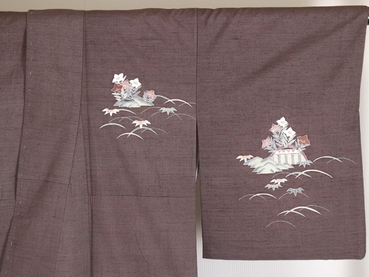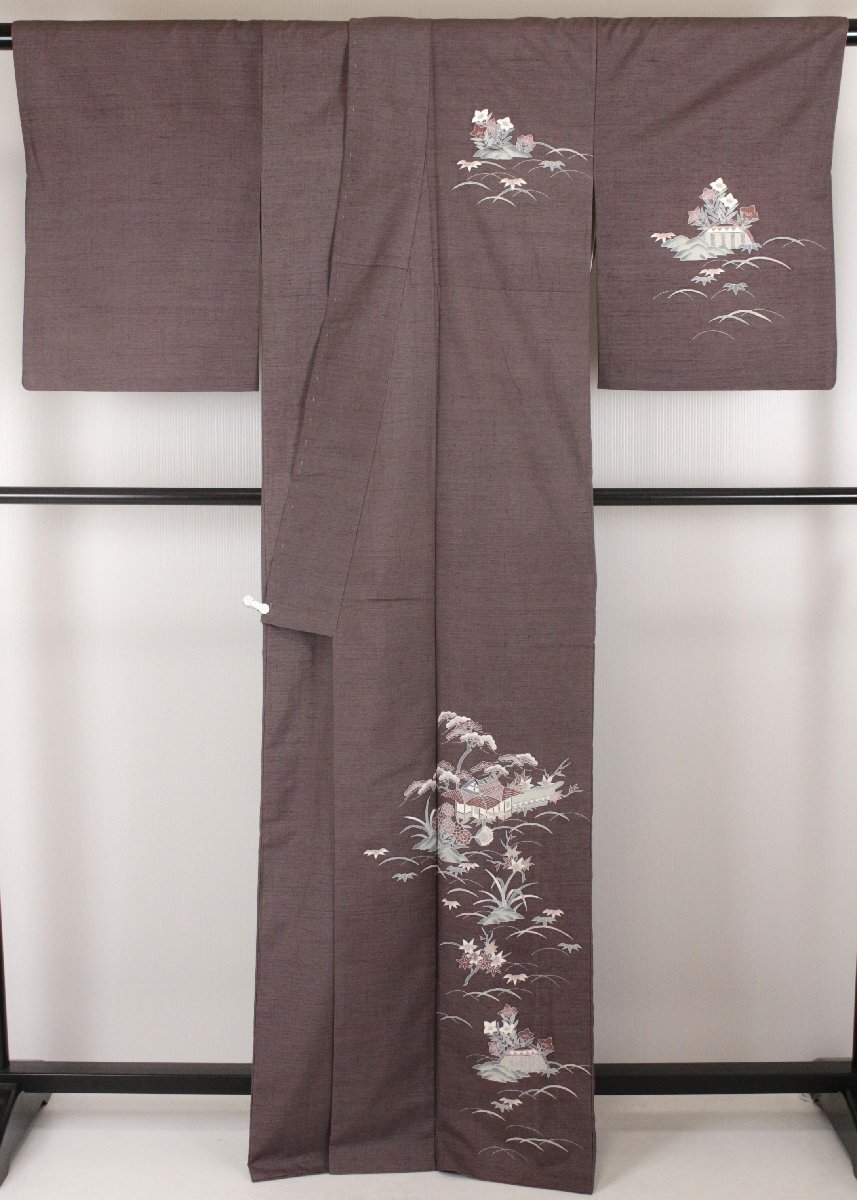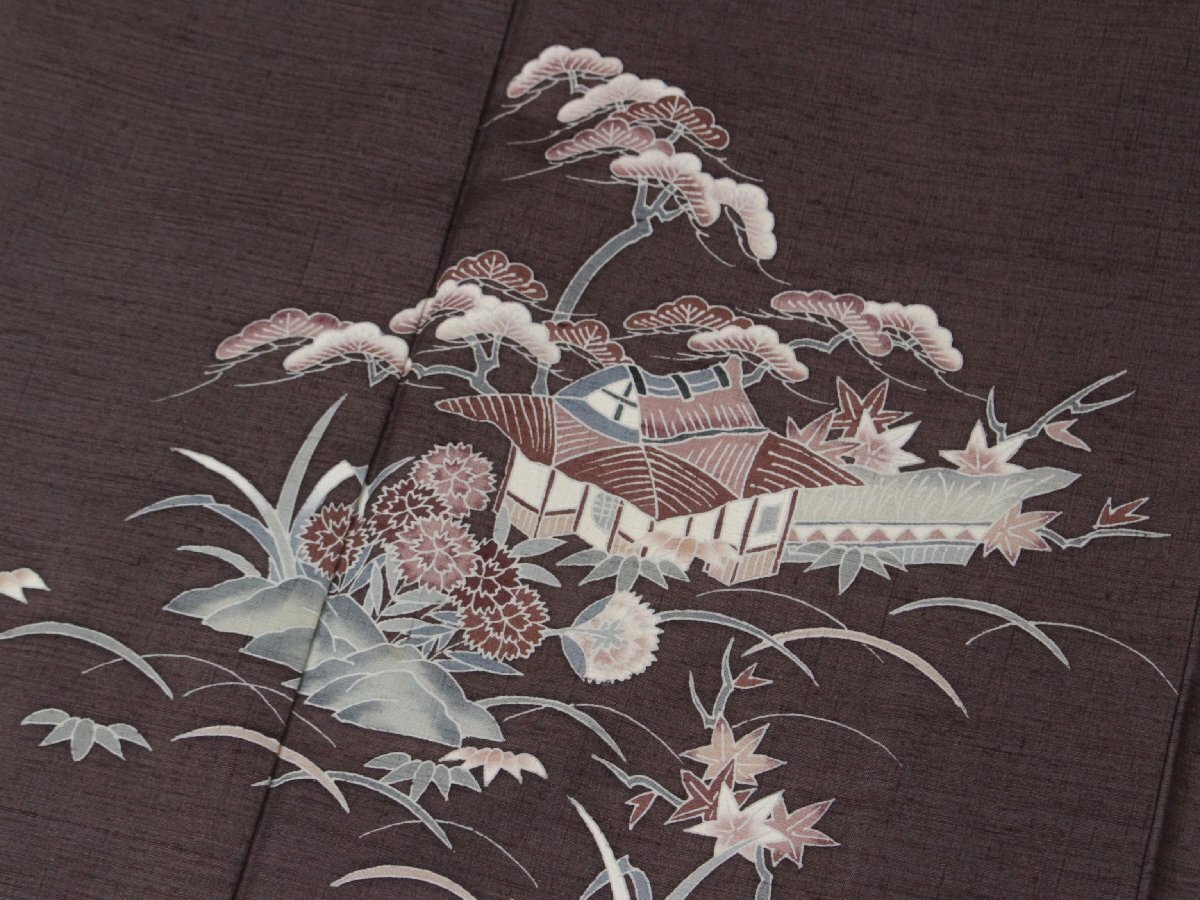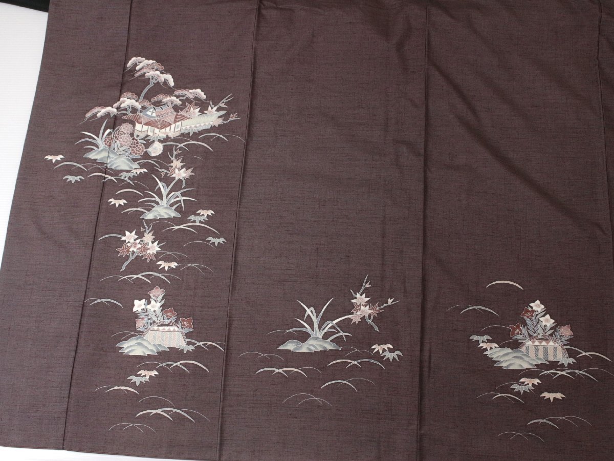 素敵な正絹紬附下のご紹介です。 落ち着きのある地色に、品格漂う家屋や松、草花が描かれた風雅な意匠が目を惹きます。 紬ならではの趣ある風合いが、素朴さと格調を兼ね備え、しっとりとした大人の装いを演出。 温もりを感じる絵柄は、古典的でありながらも柔らかな彩色により上品な雰囲気に仕上がっています。 観劇やお茶席、お出かけなど、幅広いシーンで重宝いただける一枚で、帯合わせ次第で華やかさも落ち着きも自在に表現できます。 伝統の美しさを纏いながら、日常の特別な瞬間を豊かに彩ってくれることでしょう。 お目に留まりましたら、是非ご検討下さいませ。 ※撮影時の部屋の照明によって画像の色に若干の差がございます。色味に差がございますことをご了承のうえご検討下さいませ。 …状態… 胴裏、八掛に若干の黄変あり。 ※全くの新品ではございませんので、記載のない変色やスレ、ヤケ、その他僅かな難がある場合がございます。そのような理由でのキャンセルはお受けできませんので、ご了承の上ご検討お願いいたします。 |