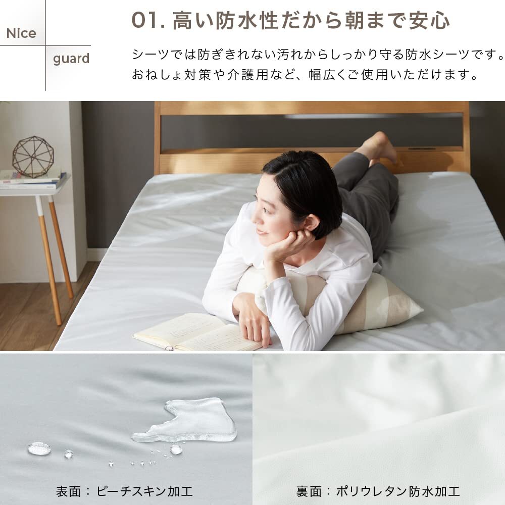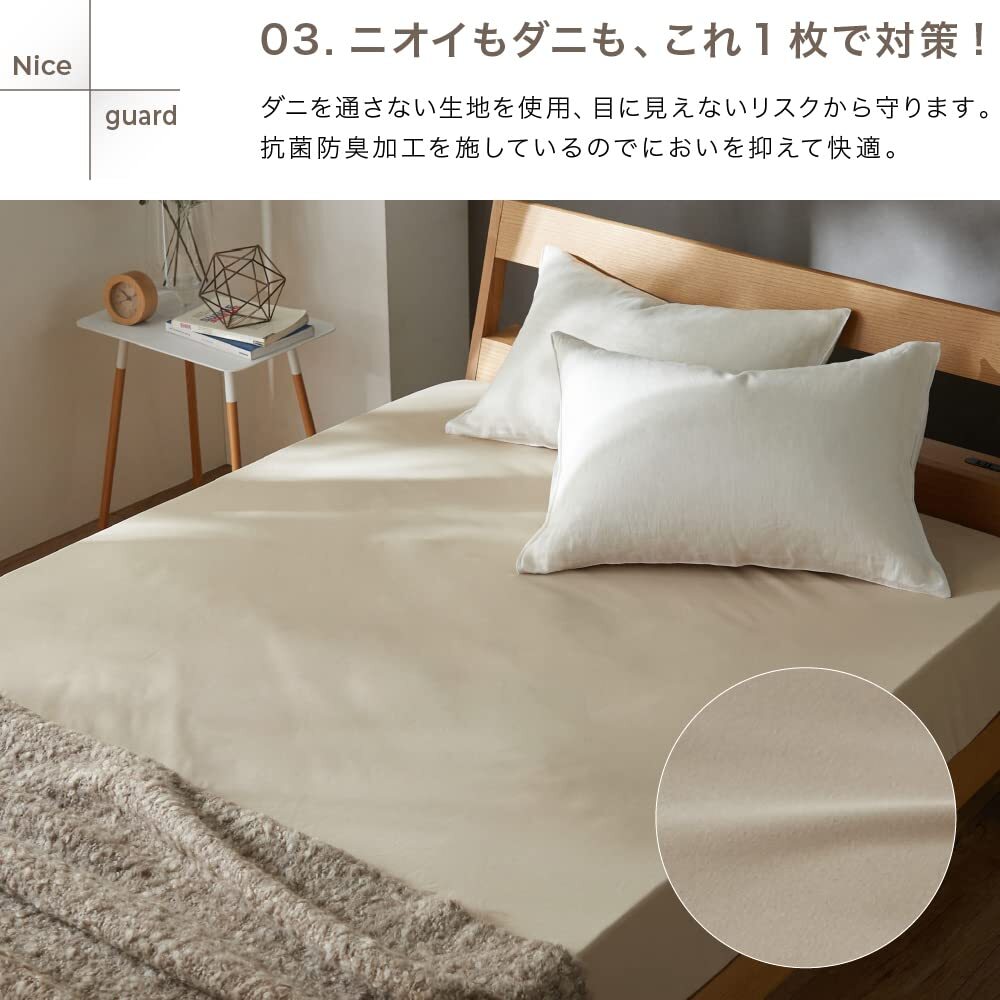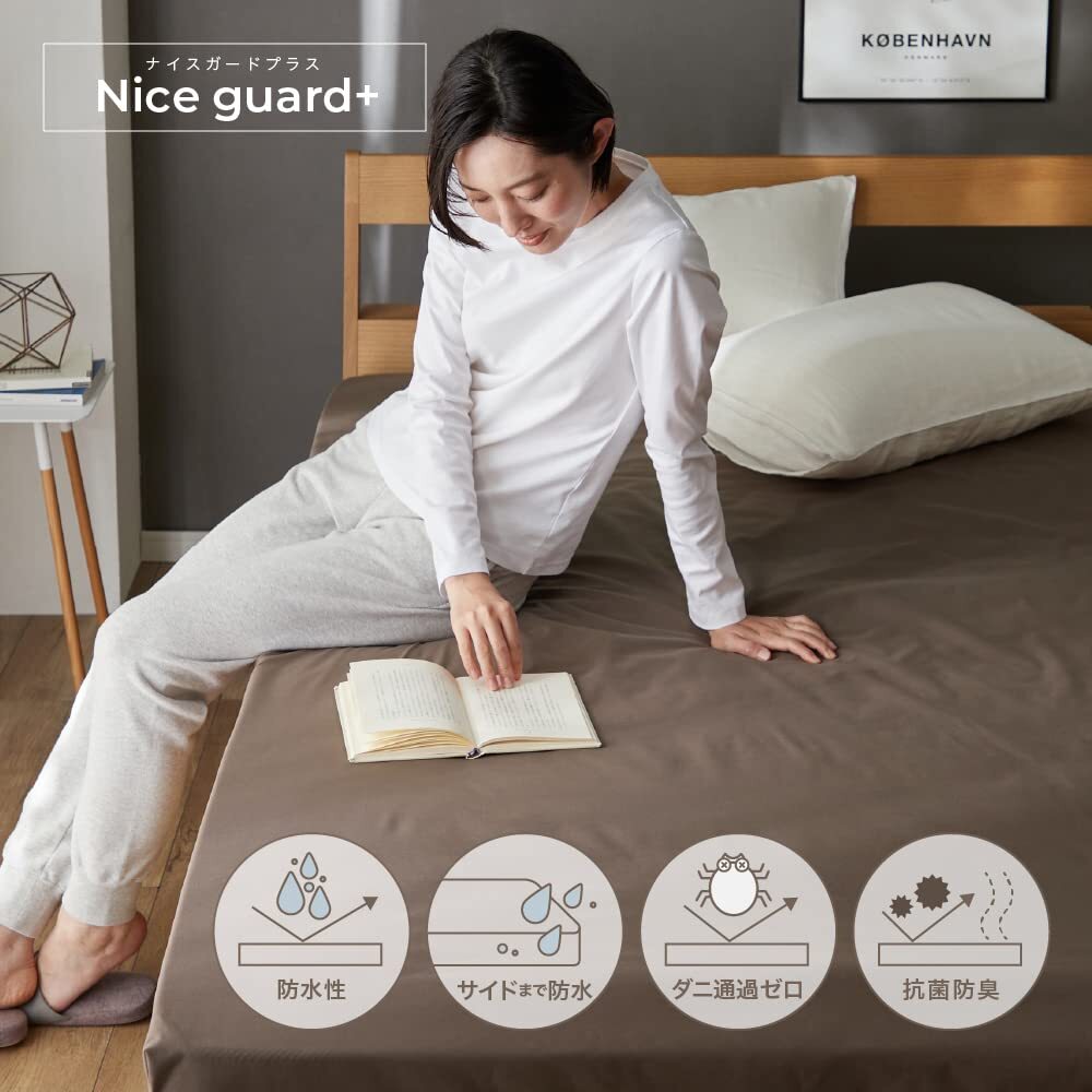 説明 商品紹介 【取返しのつかない不意な汚れからマットレスをガード】 ベッドマットレスが汚れてしまって途方に暮れたことはありませんか?カバーをしていても寝汗やおねしょ、血液などの水分は吸収されてしまい、汚れは避けられません。そんな時おすすめなのが、「NICE GUARD+(ナイスガードプラス)サイドまでしっかり防水シーツ」。リーズナブルながら、洗えないマットレスを不意の汚れからしっかり守るボックスタイプの防水シーツです。 【とことん清潔!抗菌防臭加工&ダニ通過ゼロ生地使用】 長年蓄積された寝汗や尿などによる汚れは不快なニオイの元に。1日の終わりに毎日眠るベッドだからこそ、気持ちよく眠りにつきたいものですね。NICE GUARD+(ナイスガードプラス)サイドまでしっかり防水シーツは抗菌防臭加工を施しているので、イヤなニオイを抑制し、しっかり防水することで、ニオイや汚れのしみつきを防ぎます。ダニを通さない生地を使用しているので、見えないリスクからマットレスを守ります。シーツをこまめに洗いたくない方にもおすすめ。 【さらっとすべすべ、気持ちいい肌触り】 防水機能・抗菌防臭機能・ダニ対策と機能もしっかりながら、表面はさらっとすべすべで気持ちいい肌触り。ゴワゴワしにくく、やわらかな生地感です。インテリアに馴染みやすいナチュラル&シックなカラー展開からお選びいただけます。 【株式会社AQUAについて(旧社名:株式会社ナイスデイ)】 株式会社ナイスデイは、より快適な暮らしへとお客様をサポートする企業として進化すべく、2022年10月をもって株式会社AQUAと合併する運びとなりました。当社は創業125年以上を誇る日本毛織株式会社(東証プライム上場・通称ニッケ)のグループ企業です。当社では、皆様から頂戴する貴重なご意見に耳を傾け、日々品質の向上に取り組んでおります。商品についてのご質問、ご相談、ご不明点等がございましたら何なりとお申しつけください。 安全警告 アイロン・タンブラー乾燥不可