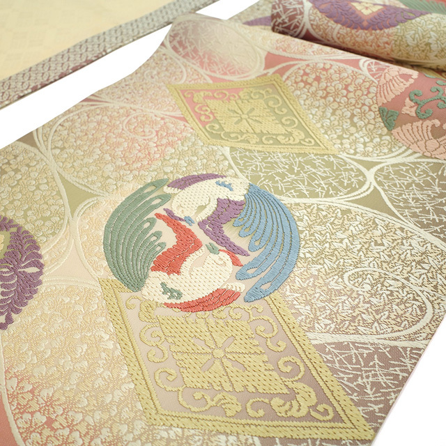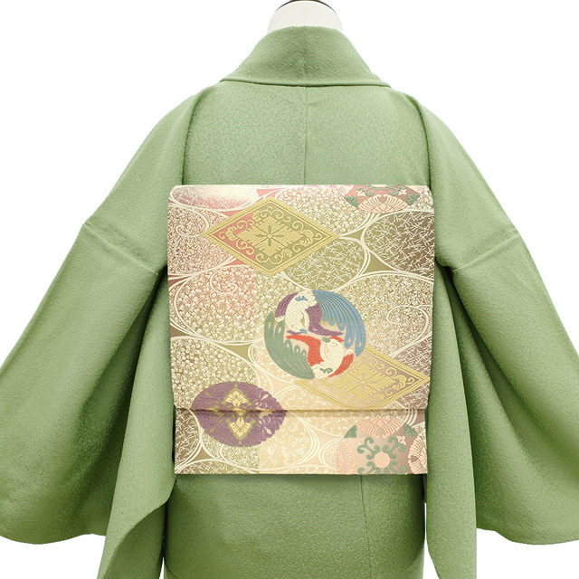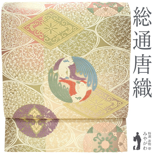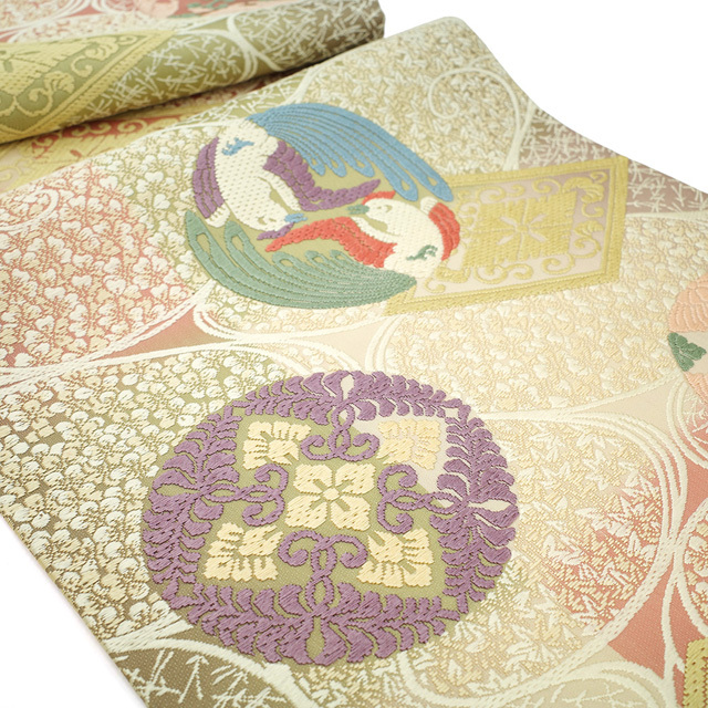 袋帯 西陣 正絹 芳彩美術織物 総通唐織 抹茶色 桃色 クリーム色 有職文様 花丸 向かい鳥 額縁仕立て 新古品 仕立て上がり みやがわ sb54568