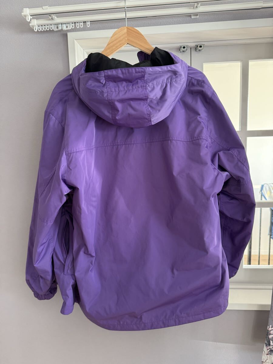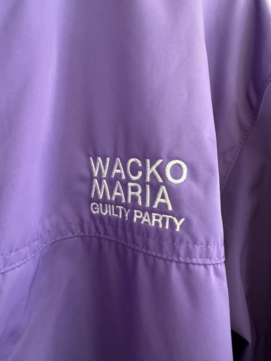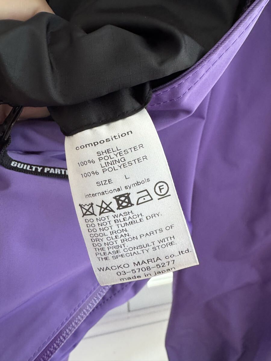 パープルのナイロンジャケット、フード付きで刺繍ロゴ入り。