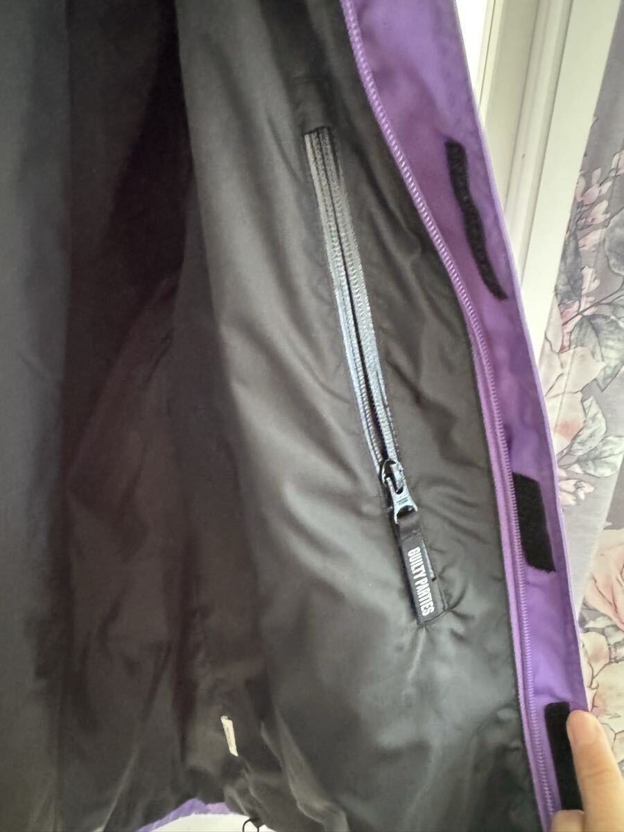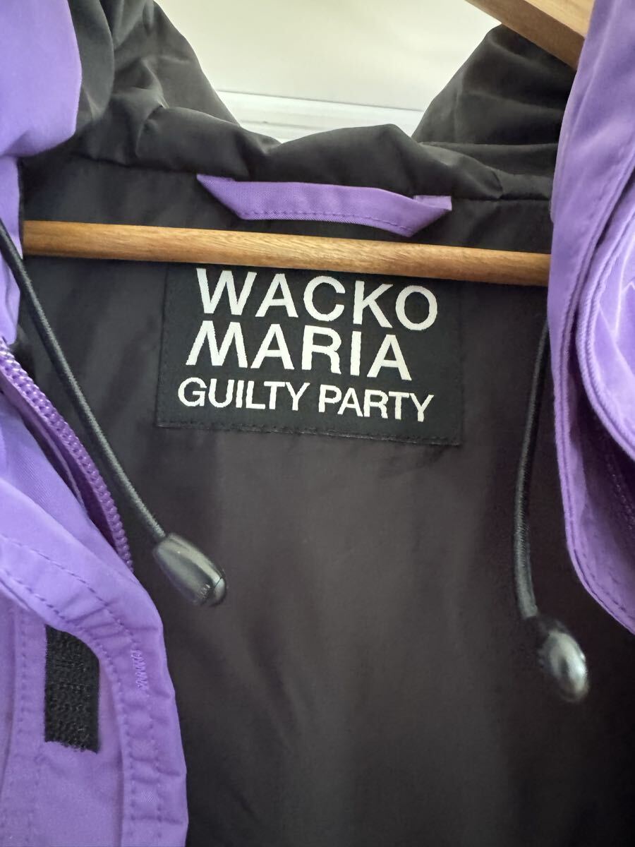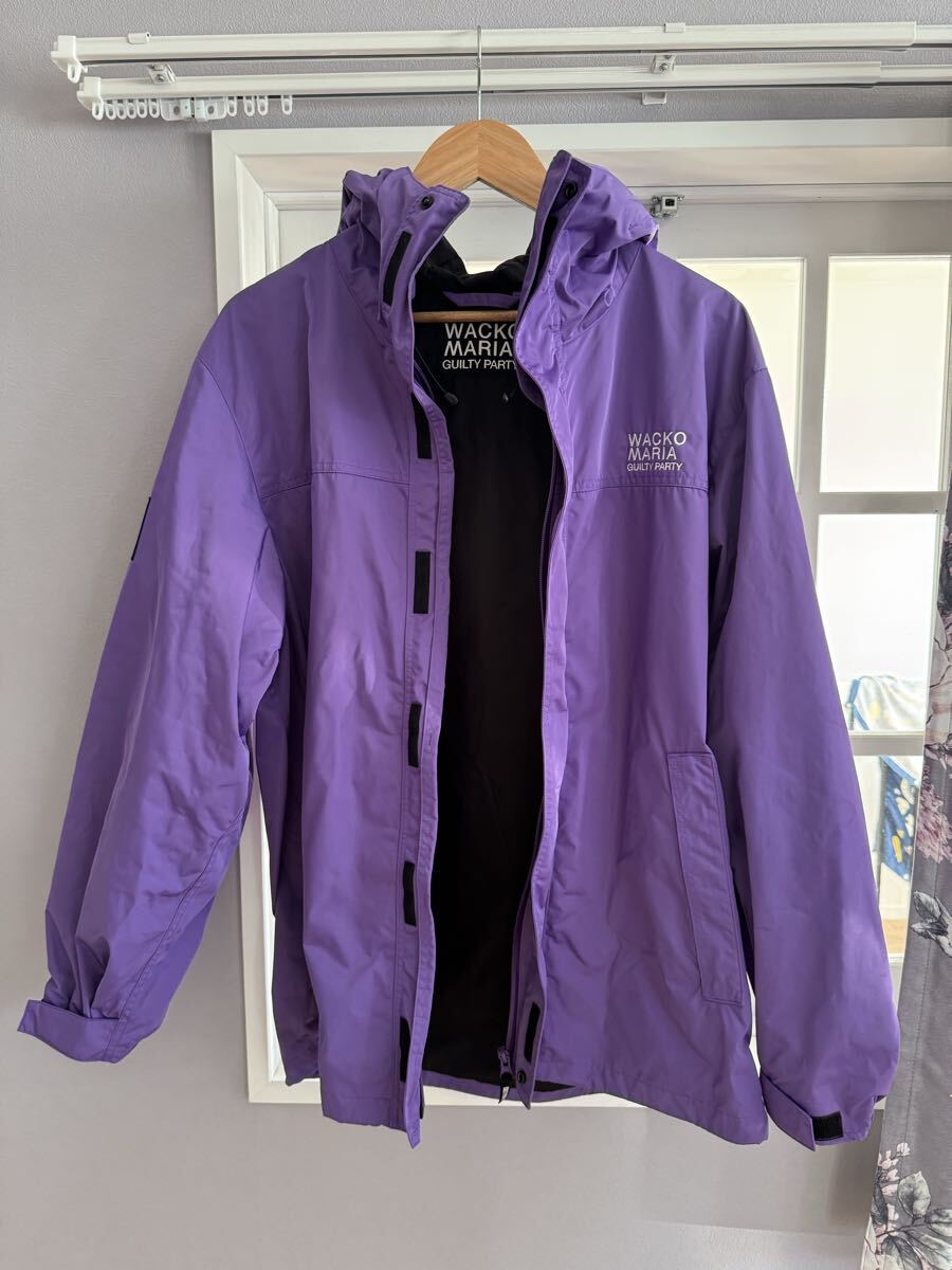 パープルのナイロンジャケット、フード付きで刺繍ロゴ入り。