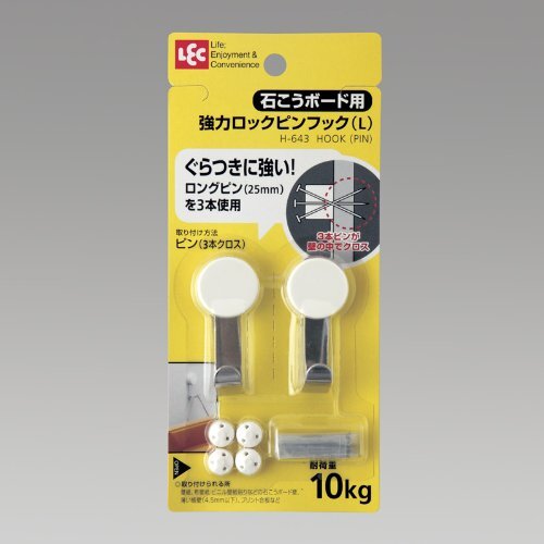 商品紹介 ●ロングピン(25mm)を3本使用でしっかり固定するので、ぐらつきに強い。 ●3本のピンが壁の中でクロスすることで、石こうボードに強力に固定できる。 ●取付けられる所:壁紙・布壁紙・ビニル壁紙張りなどの石こうボード壁、薄い板壁(4.5mm以下)、プリント合板、カモイ ●取付けられない所:吸音ボード、土壁、しっくいなどのもろい壁、コンクリート・ブロック・レンガなどのかたい壁、タイル及びタイルの目地 より ●耐荷重10kgの強力フック ●3本のピンが壁の中でクロスするのでぐらつきに強いです ●フック部はサビに強く丈夫なステレス製 ●取付けられる場所:壁紙・布壁紙・ビニル壁紙貼りなどの石こうボード壁、薄い板壁(4.5mm以下)、プリント合板 ●取付けられない所:吸音ボード、土壁、しっくいなどのもろい壁、コンクリート・ブロック・レンガなどのかたい壁、タイル及びタイルの目地